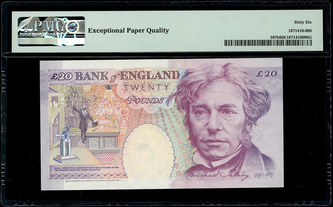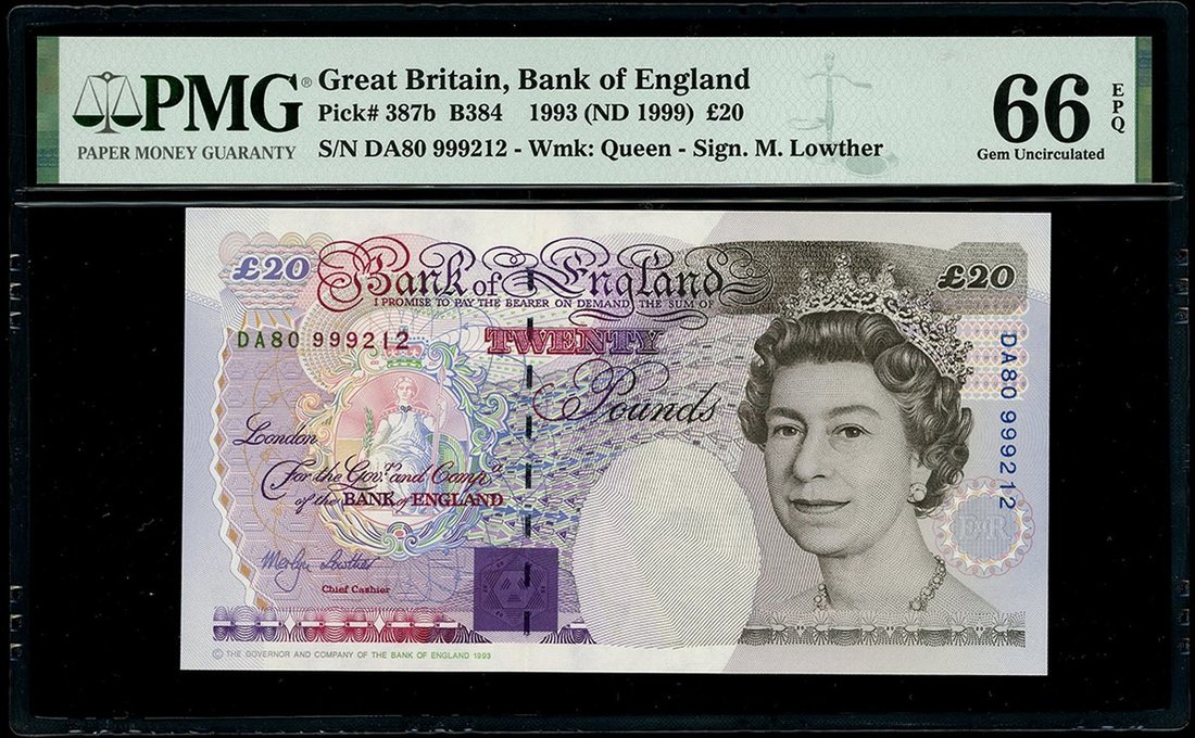 1993年英國20鎊,編號DA80 999212,PMG 66EPQ,罕見勞瑟簽名及尾字軌,珍品