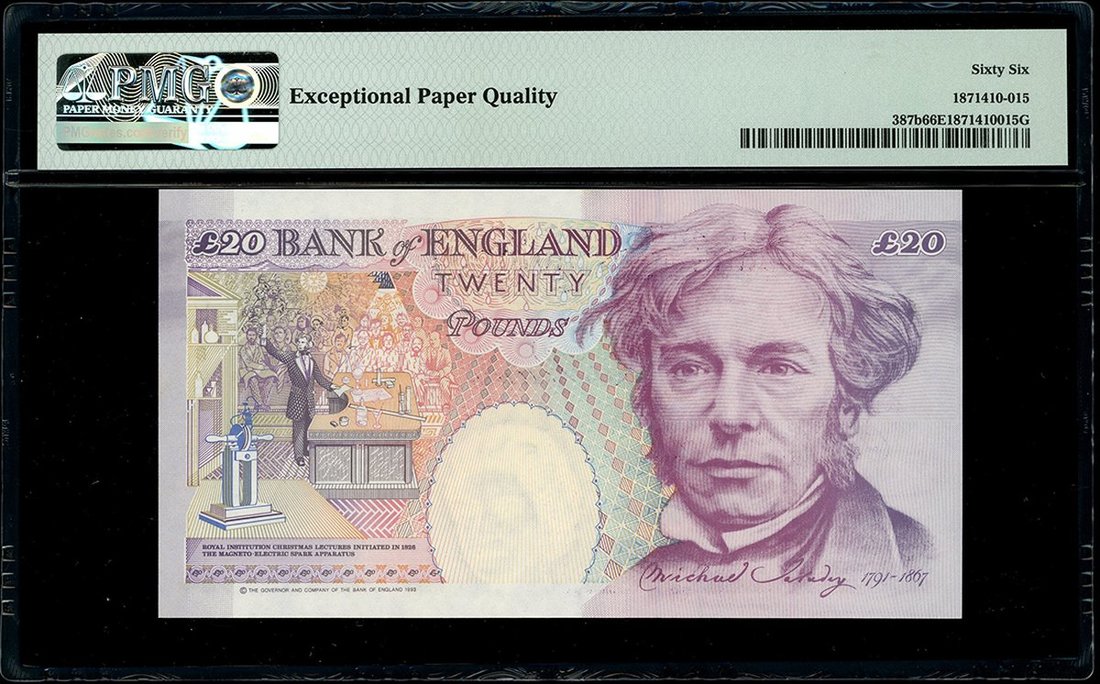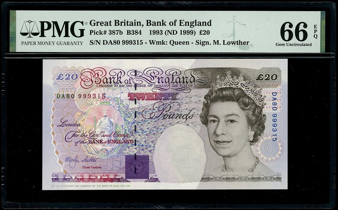 1993年英國20鎊,編號DA80 999315,PMG 66EPQ,罕見勞瑟簽名及尾字軌,珍品