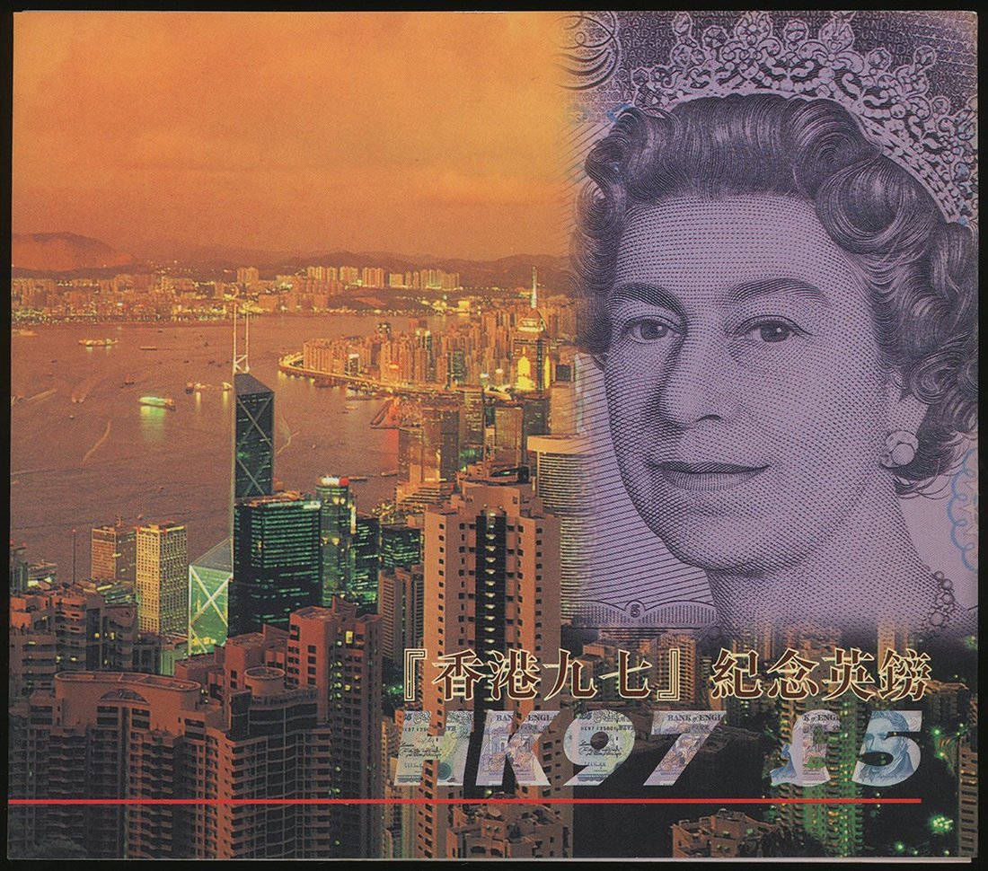 英國一組7枚,包括1997年香港回歸紀念5鎊,特別字軌HK97 816173,另有10先令連號5枚,及1鎊,編號 66S 656615-19及T60K 694761,5鎊UNC連原封套,其餘AU
