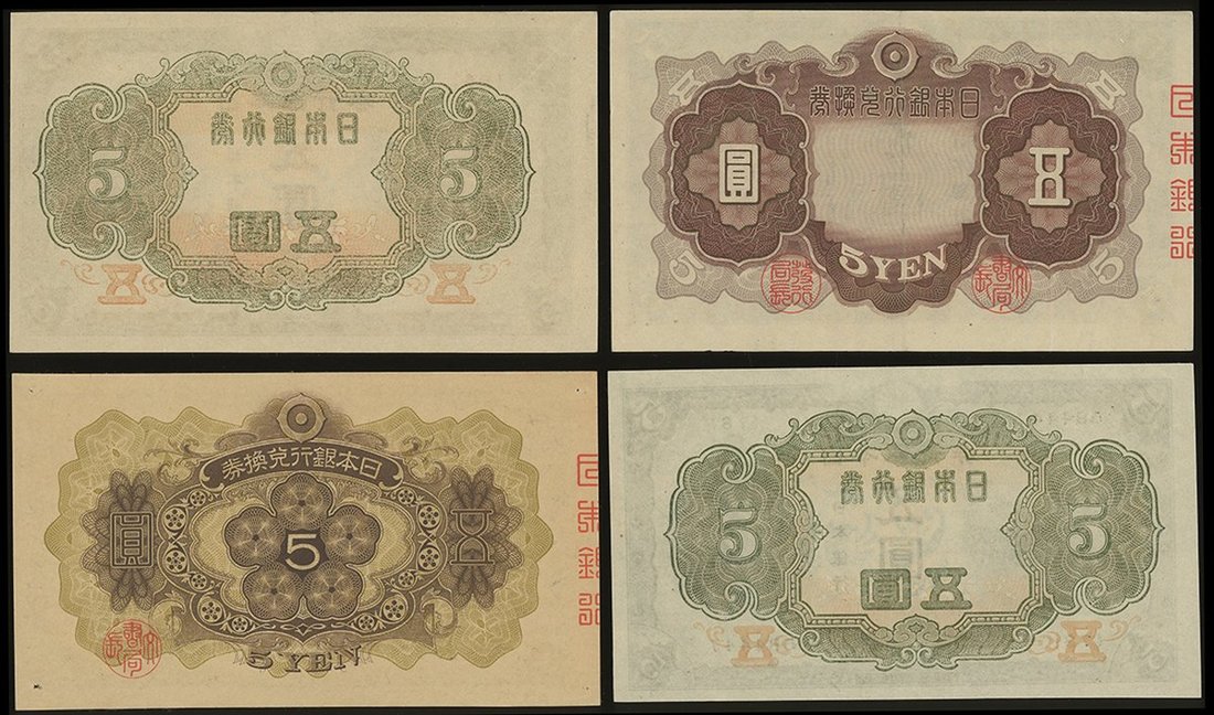 1930, 1942, 1943-1944 及 1944年日本5元一組4枚,EF至UNC,罕見的一組