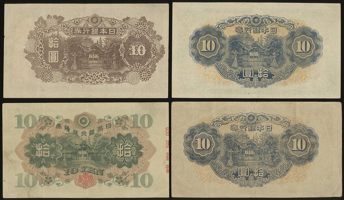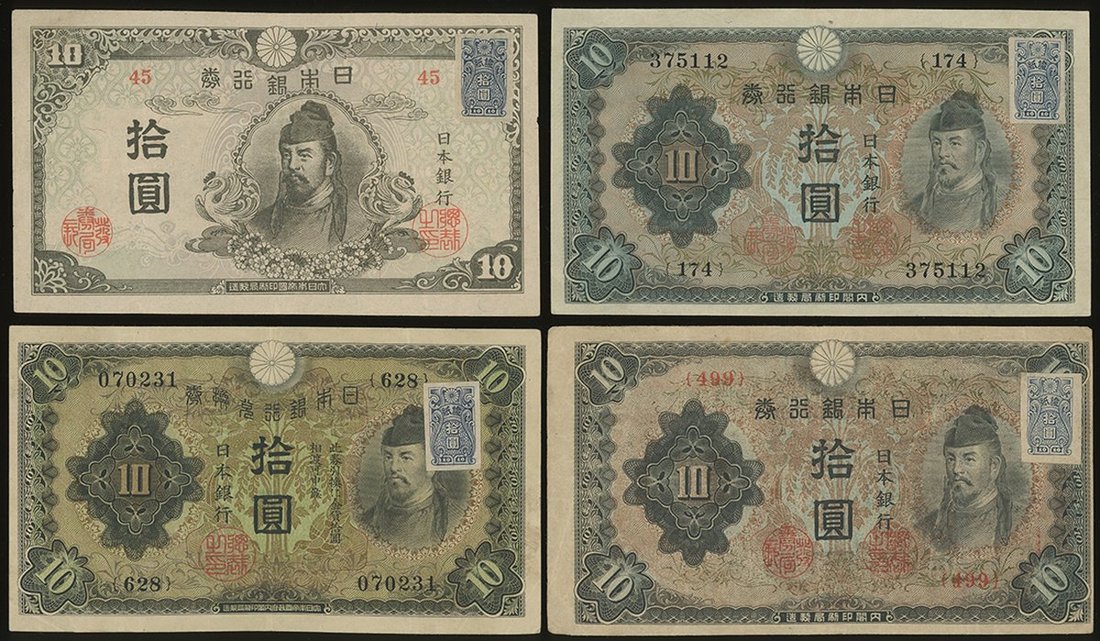 Japan, 4 different types of 10 yen, all with the validation stamps (the 1946 Provisional issue), original dates are: 1930, 1943-44, 1944-1945 and 1945,