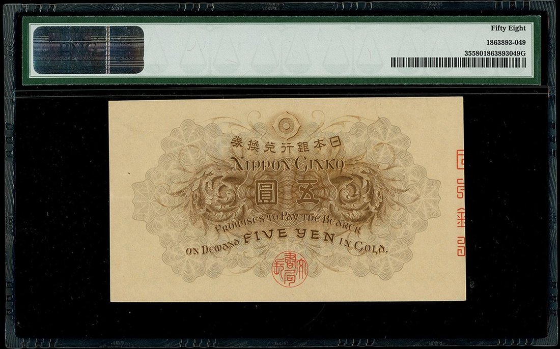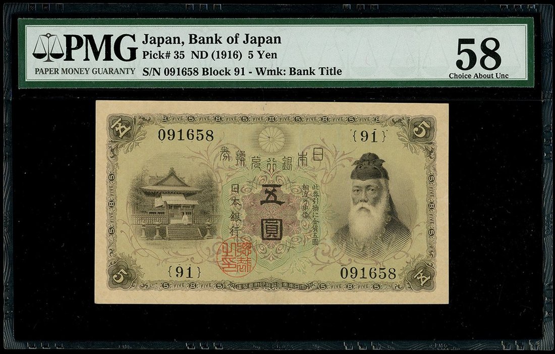Bank of Japan, 5 Yen, ND (1916), serial number {91} 091658, (Pick 35), PMG 58 Choice About Uncirculated