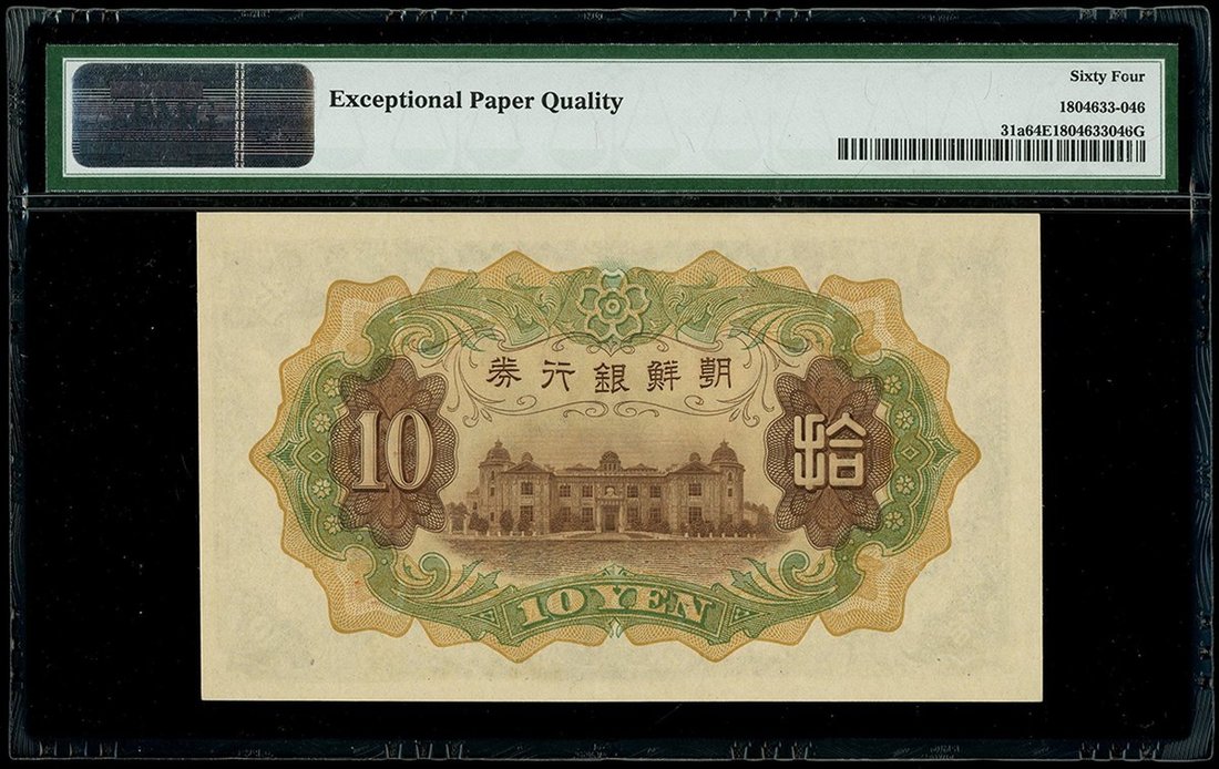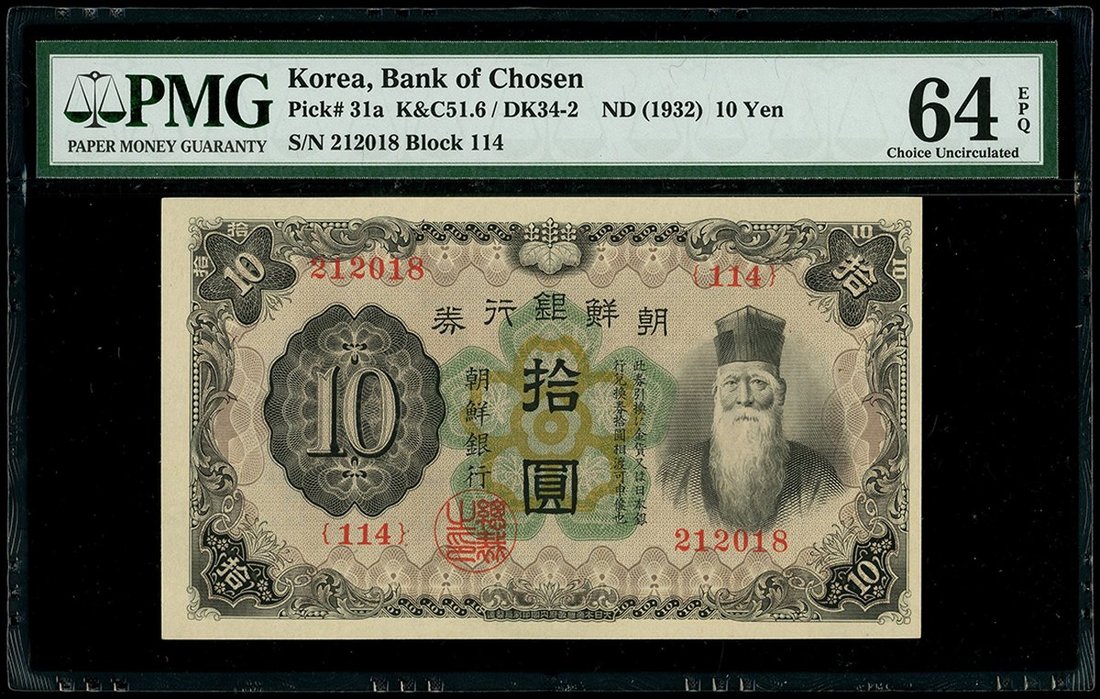 Bank of Chosen, 10 Yen, ND (1932), serial number {114} 212018, (Pick 31a), PMG 64EPQ Gem Uncirculated