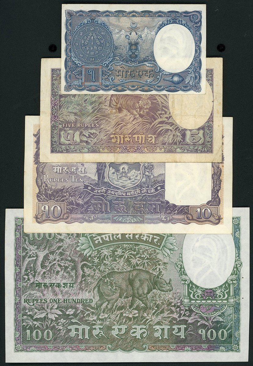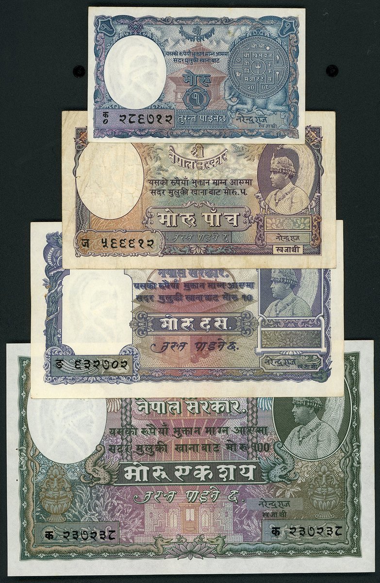 1951年尼泊爾一組4枚,1、5、10及100莫如,無日期,編號289712, 596612, 632702 及 237238,1及10莫如VF至EF,5莫如F至VF,100莫如AU至UNC