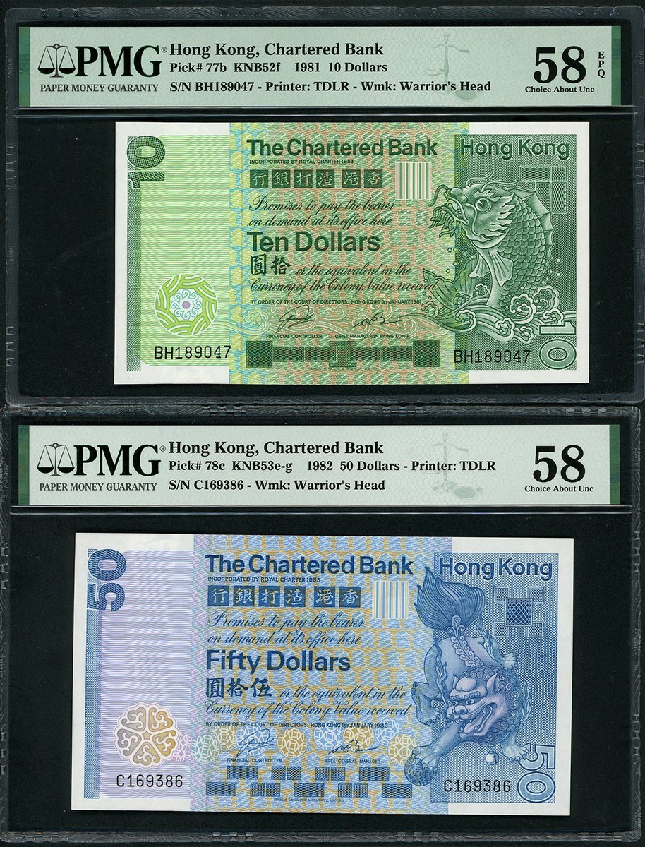 香港紙鈔一組4枚,包括渣打銀行1981年10元、1982年50元、1977年100元、及匯豐銀行1969年50元,編號BH189047, C169386, J886847 及 707248L,分別評PMG 58EPQ, 58, 50EPQ 及 58EPQ