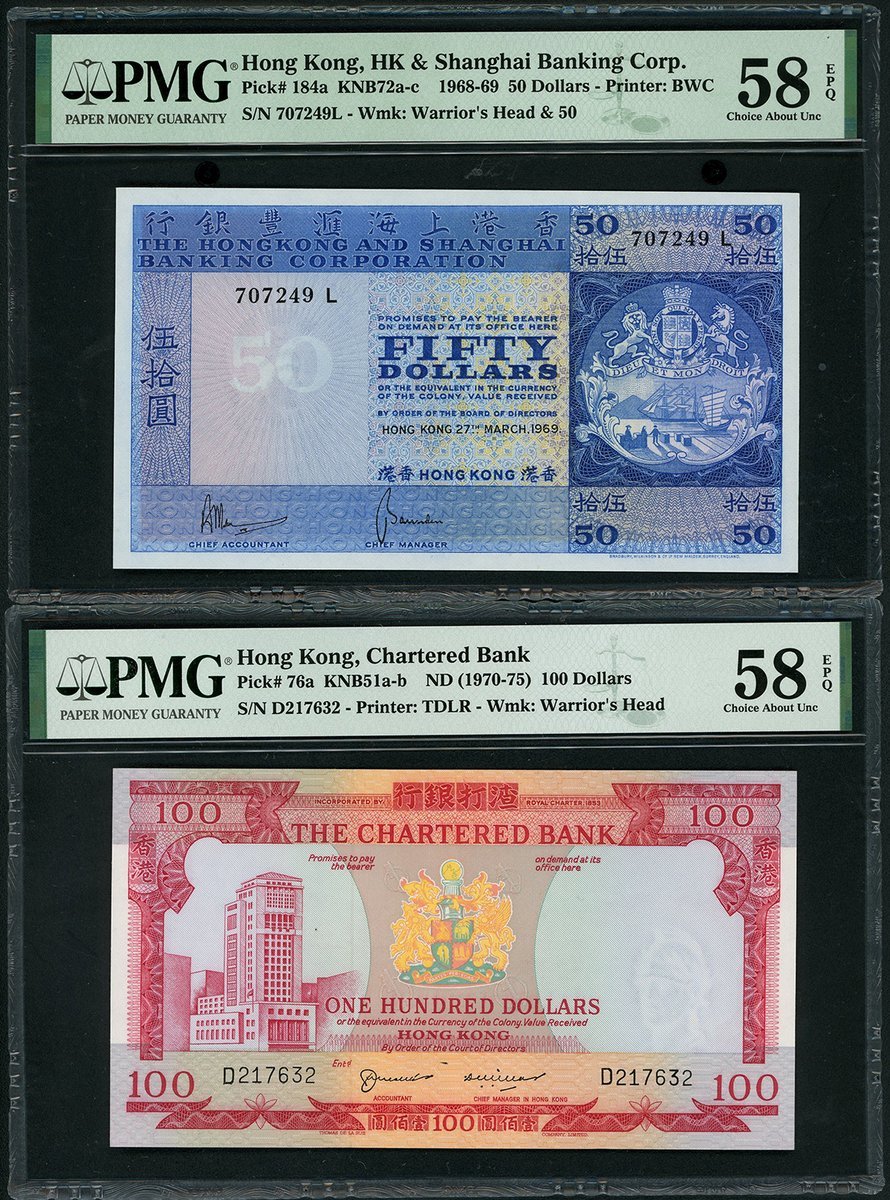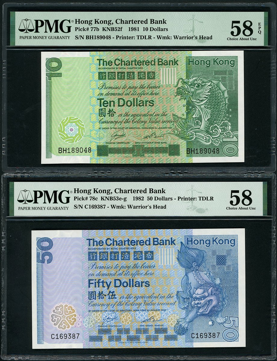 香港紙鈔一組4枚,包括渣打銀行1981年10元、1982年50元、1970-75年無日期100元、及匯豐銀行1969年50元,編號BH189048, C169387, D217632 及 707249L,分別評PMG 58EPQ, 58, 58EPQ 及 58EPQ