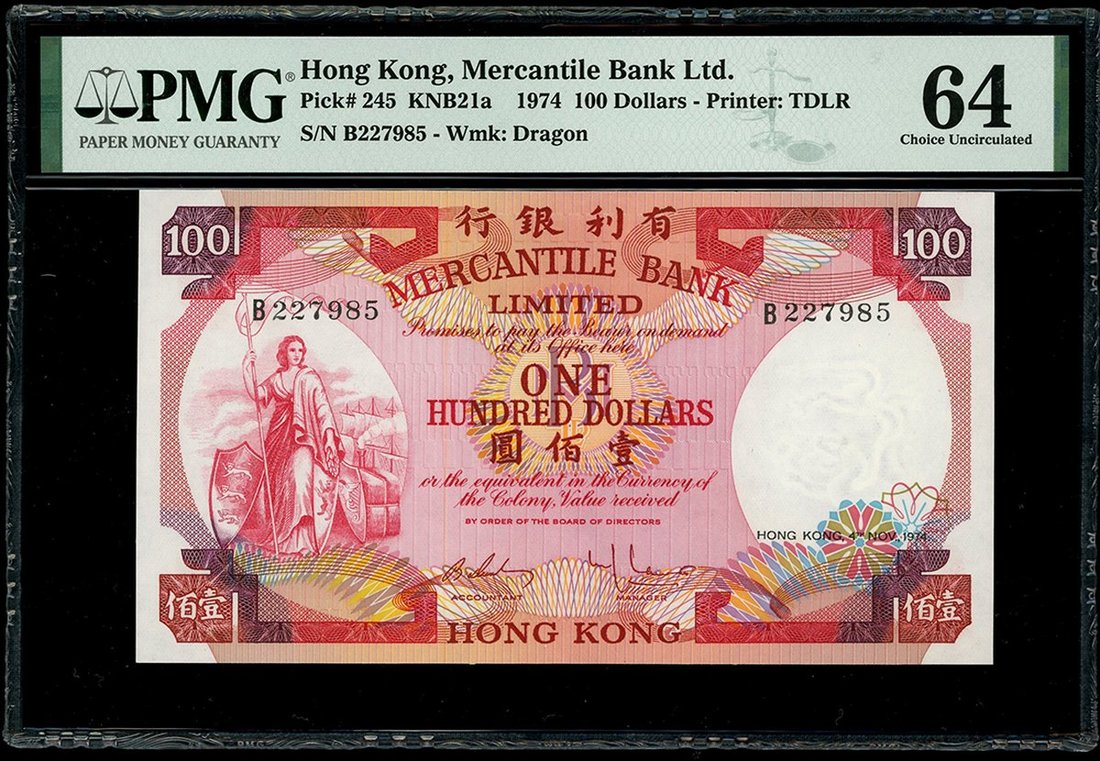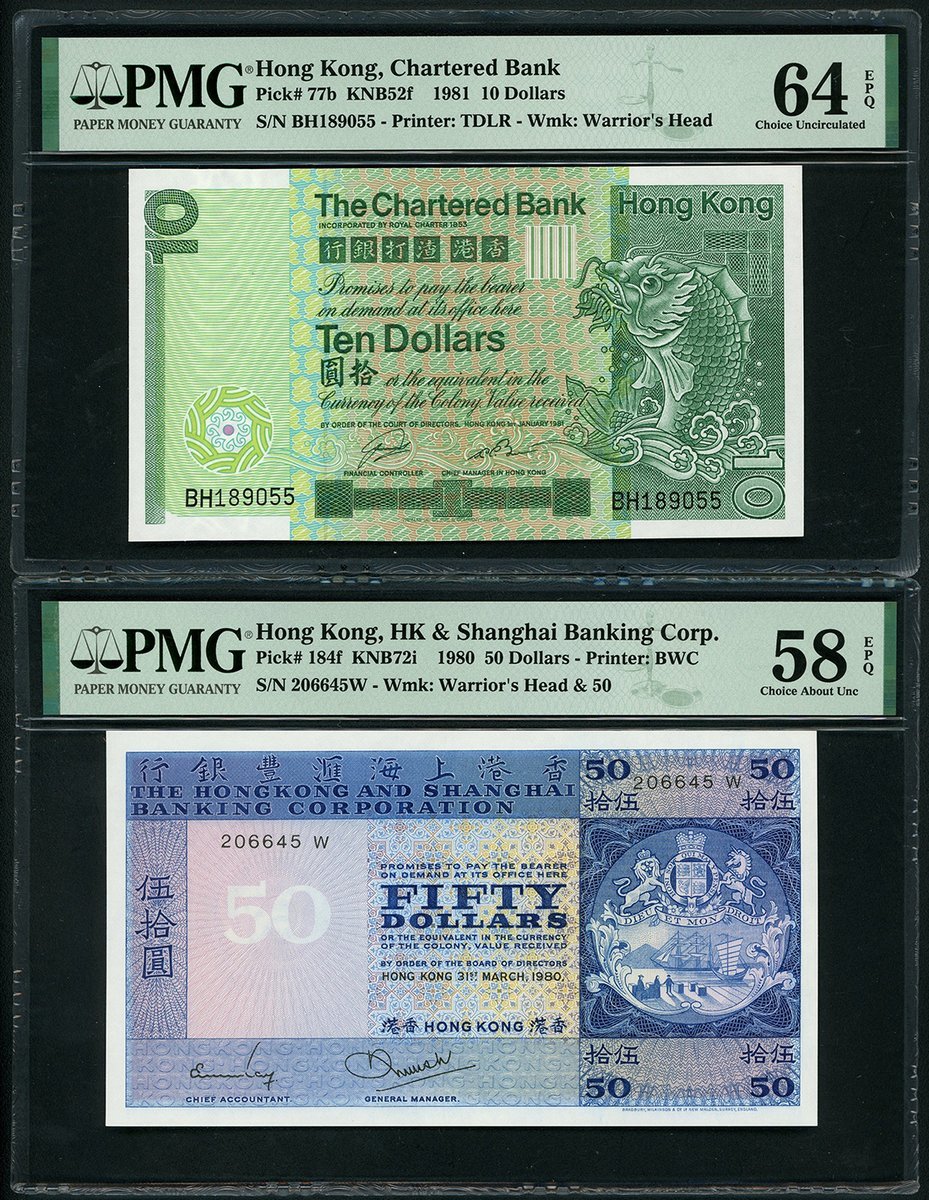 Hong Kong, The Chartered Bank, $10, 1.1.1981, HSBC $50, 31.3.1980, and Mercantile Bank $100, 4.11.1974, serial numbers BH189055, 206645W and B227985, (Pick 77b, 184f, 245), graded PMG 64EPQ, 58EPQ and 64 respectively (3)