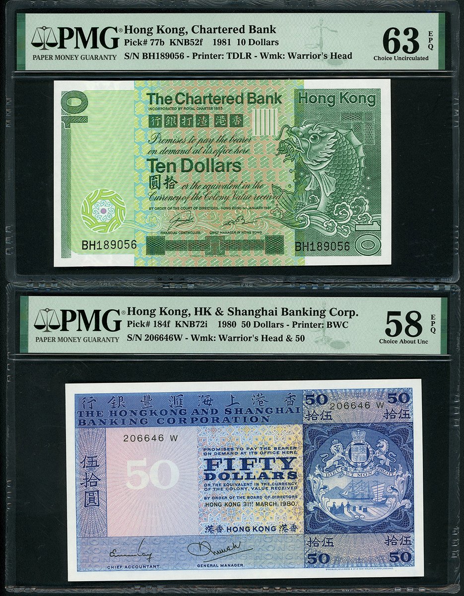 香港紙鈔一組3枚,包括渣打銀行1981年10元、匯豐銀行1980年50元及利銀行1974年有100元,編號BH189056, 206646W 及 B227986,分別評PMG 63EPQ, 58EPQ 及 64