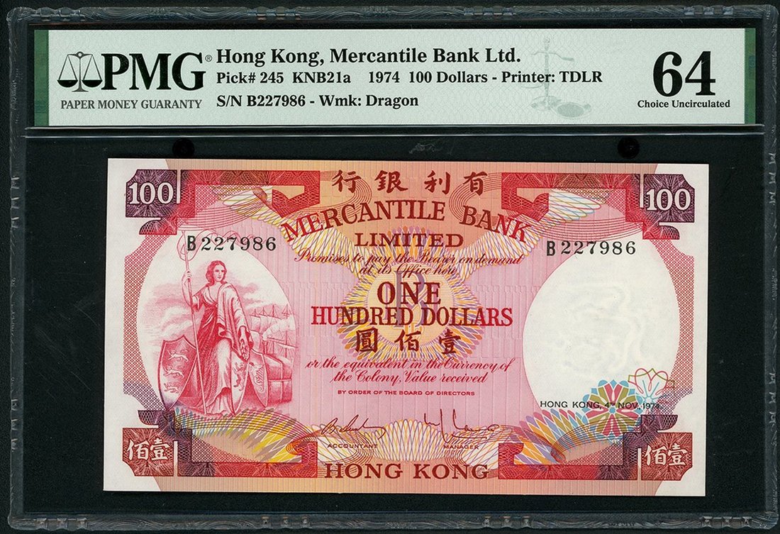 Hong Kong, The Chartered Bank, $10, 1.1.1981, HSBC $50, 31.3.1980, and Mercantile Bank $100, 4.11.1974, serial numbers BH189056, 206646W and B227986, (Pick 77b, 184f, 245), graded PMG 63EPQ, 58EPQ and 64 respectively (3)