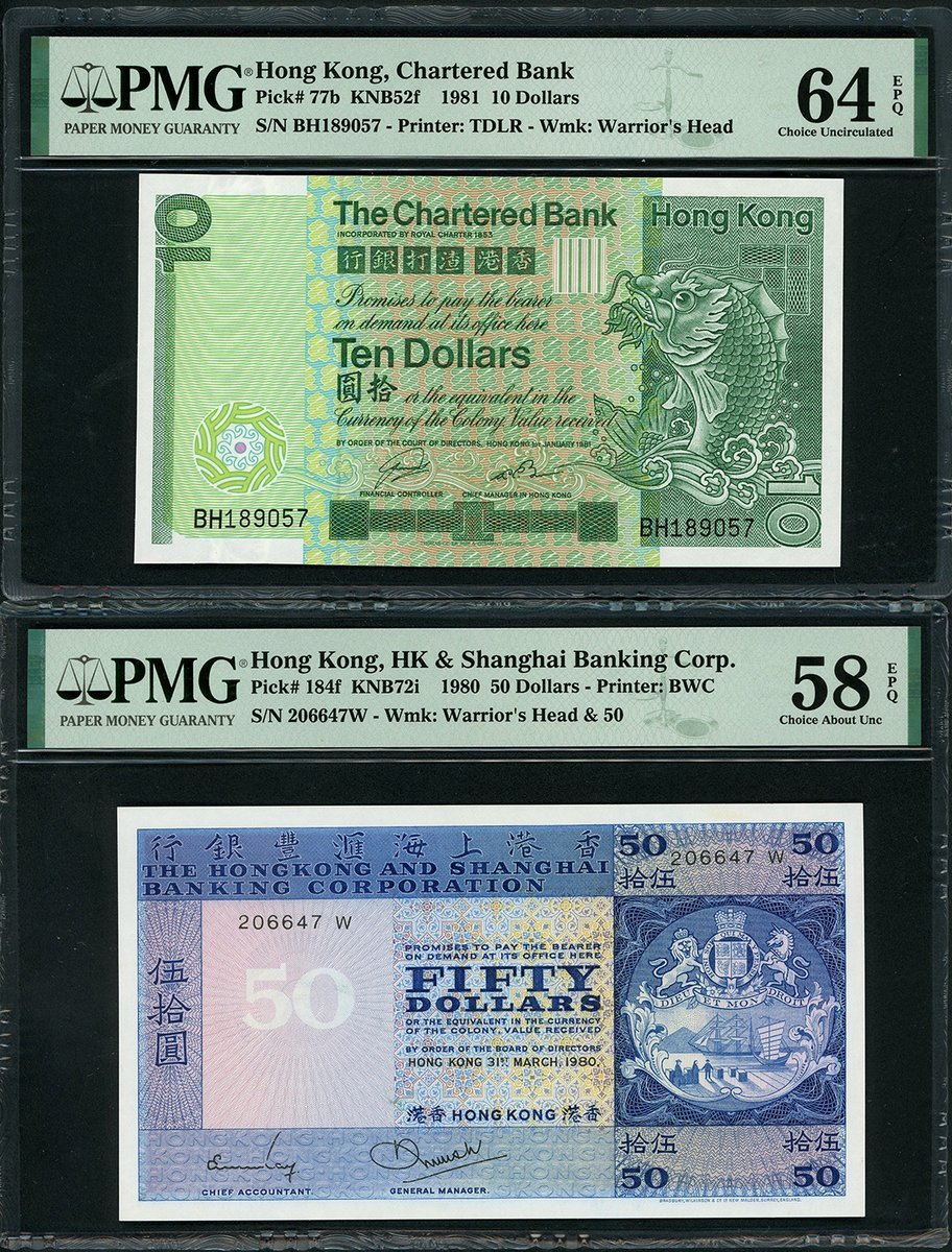 香港紙鈔一組3枚,包括渣打銀行1981年10元、匯豐銀行1980年50元及有利銀行1974年100元,編號BH189057, 206647W 及 B227987,分別評PMG 64EPQ, 58EPQ 及 64
