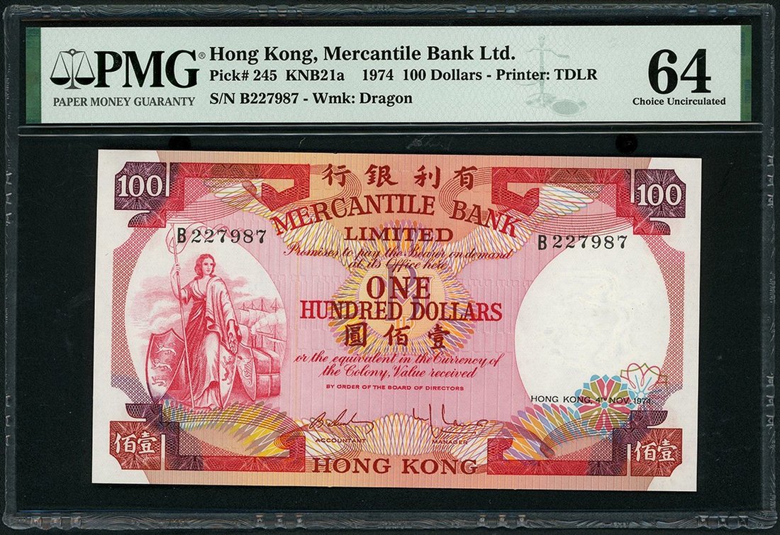 Hong Kong, The Chartered Bank, $10, 1.1.1981, HSBC $50, 31.3.1980, and Mercantile Bank $100, 4.11.1974, serial numbers BH189057, 206647W and B227987, (Pick 77b, 184f, 245), graded PMG 64EPQ, 58EPQ and 64 respectively (3)