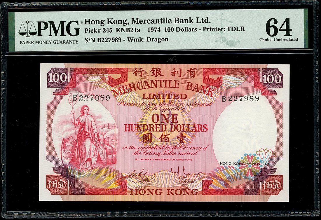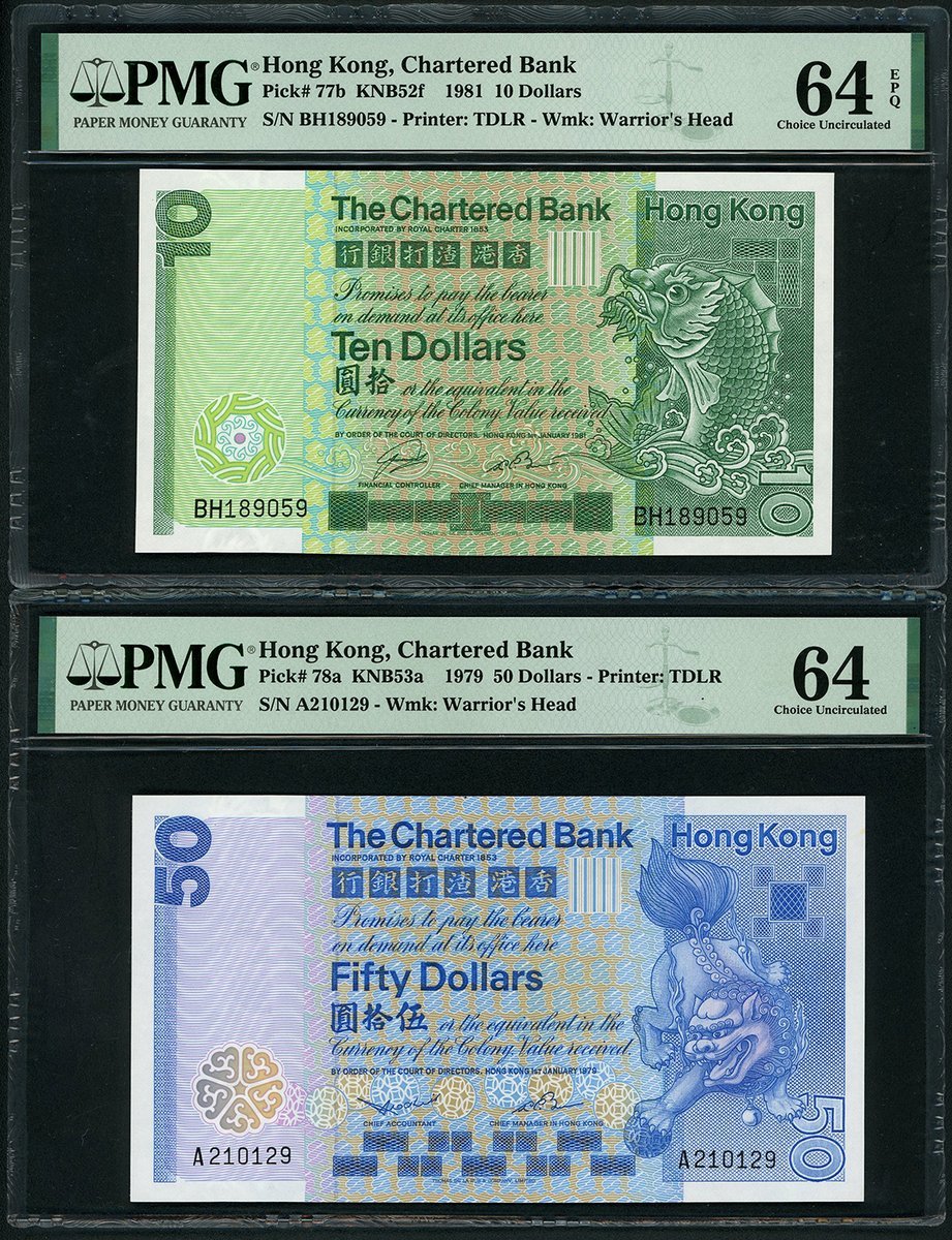 Hong Kong, The Chartered Bank, $10, 1.1.1981 and $50, 1.1.1979, also Mercantile Bank $100, 4.11.1974, serial numbers BH189059, A210129 and B227989, (Pick 77b, 78a, 245), graded PMG 64EPQ, 64 and 64 respectively (3)