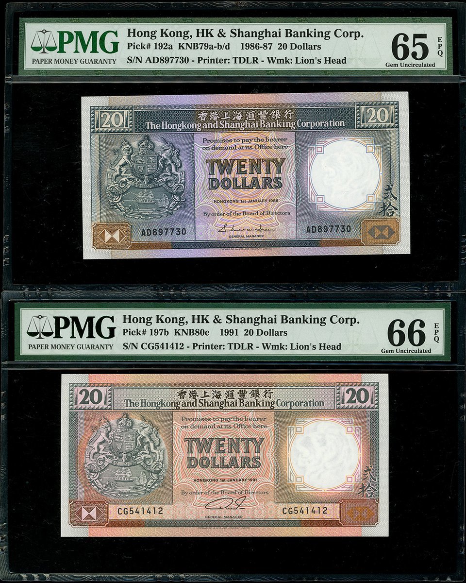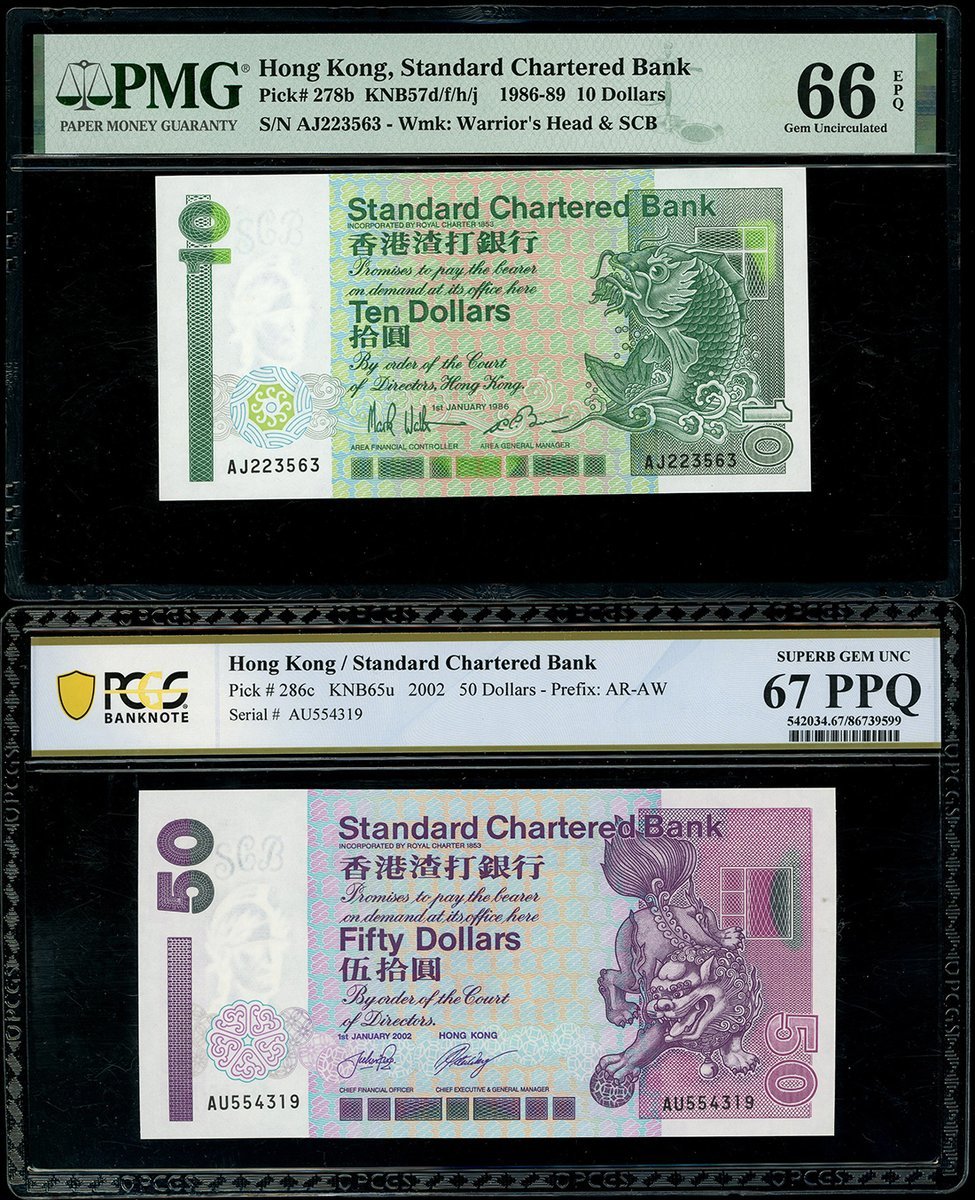 香港紙鈔一組5枚,包括渣打銀行1986年10元、2002年50元,匯豐銀行1986年20元一對及1985年50元,編號AJ223563, AU554319, AD897730, CG541412 及 AA145753,分別評PMG 66EPQ, PCGS Banknote 67PPQ, PMG 65EPQ, 66EPQ 及 64EPQ