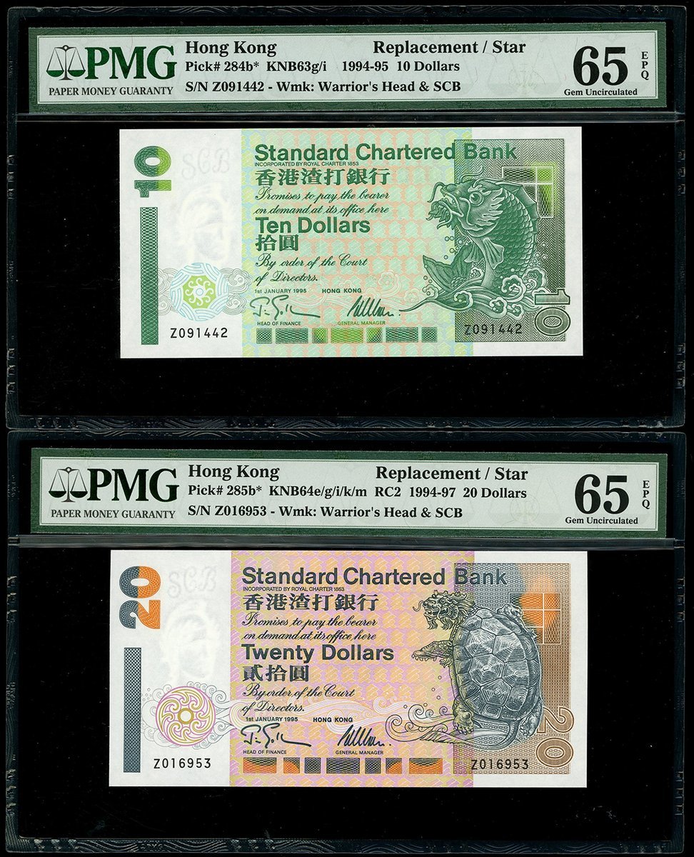 Standard Chartered Bank, a pair of $10 and $20, 1.1.1995, replacement serials Z016953 and Z091442, (Pick 284b*, 285b*), both graded PMG 65EPQ Gem Uncirculated (2)