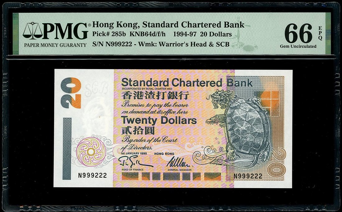 1995年渣打銀行20元,趣味號N999222, PMG 66EPQ,正面左方有輕微銹漬