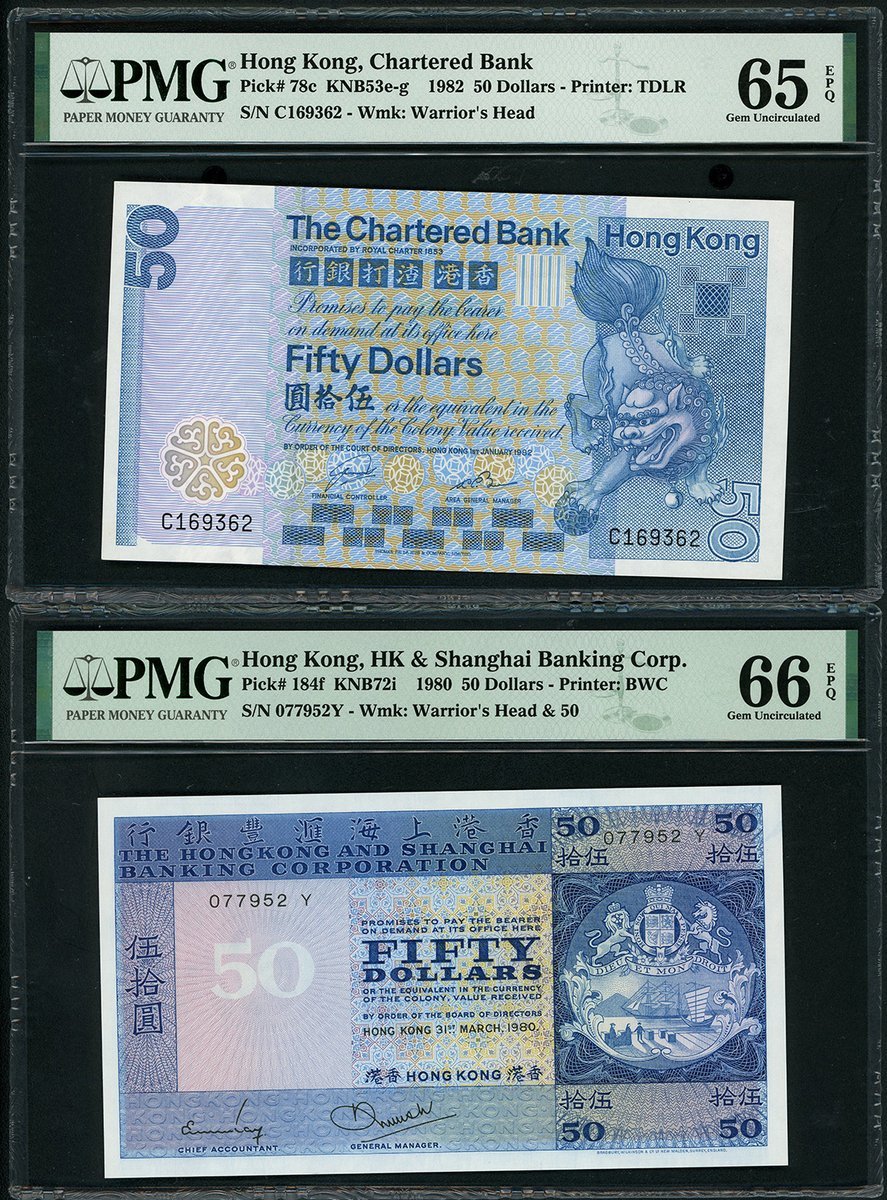 香港紙鈔一組2枚,包括渣打銀行1982年50元及匯豐銀行1980年50元,編號C169362 及 077952Y,分別評PMG 65EPQ 及 66EPQ