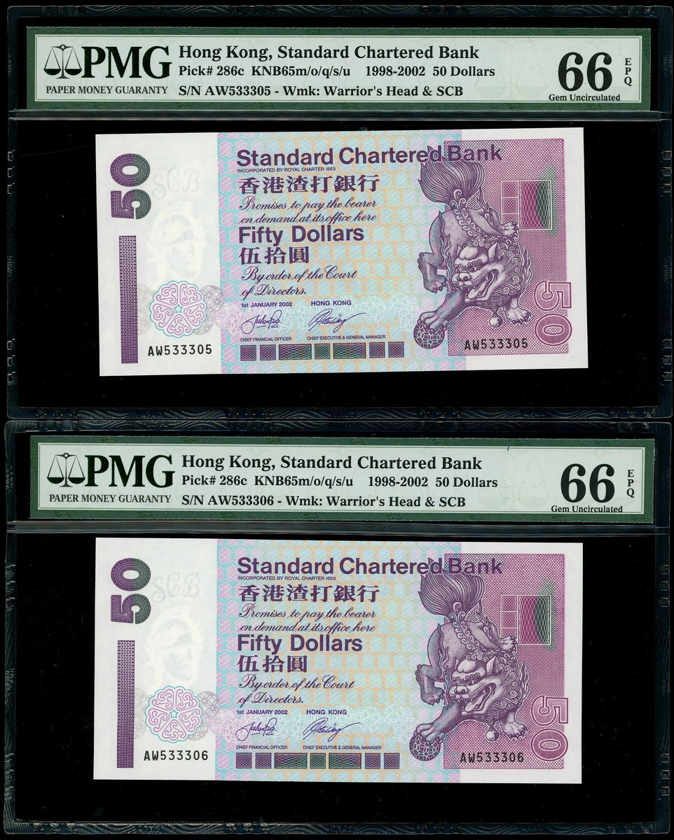 2002年渣打銀行50元連號2枚,編號AW533305-3006,均評PMG 66EPQ