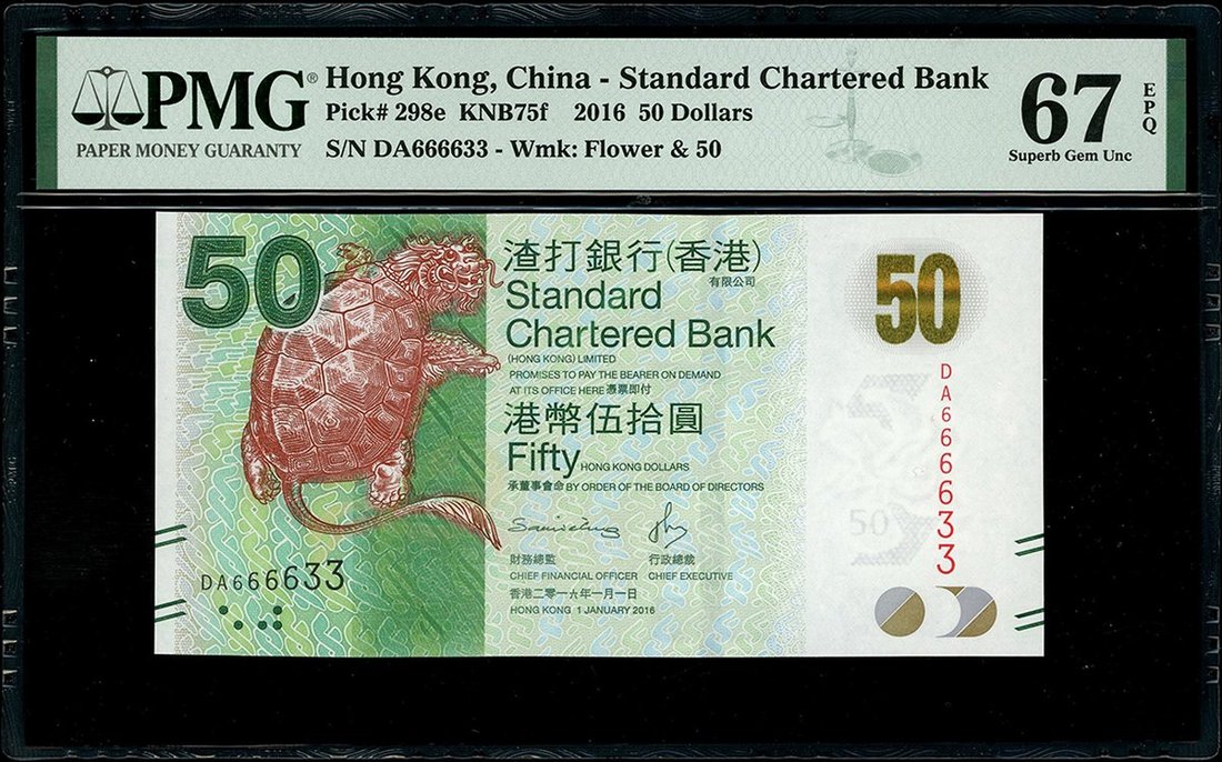 2016年渣打銀行50元,趣味號DA666633,PMG 67EPQ