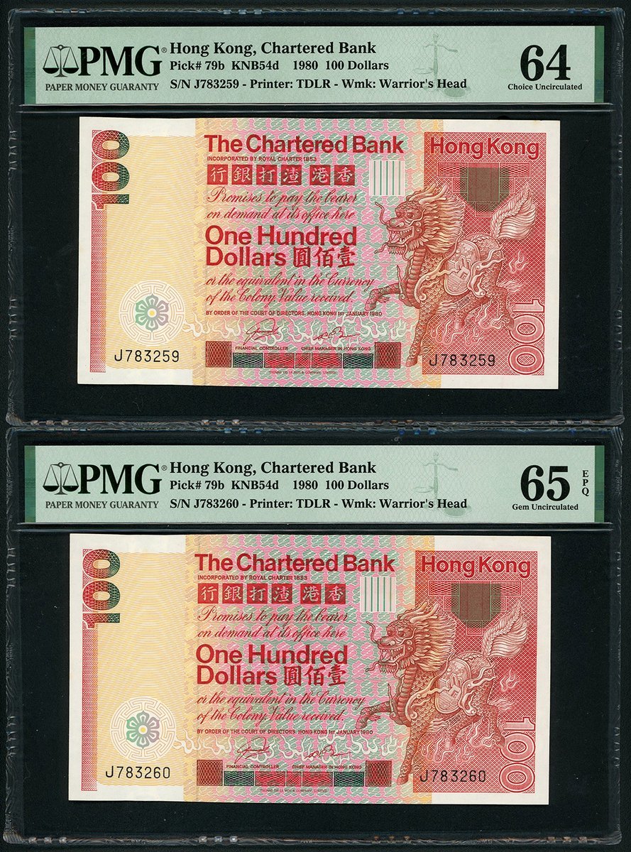 1980年渣打銀行100元一對,連號J783259-260,分別PMG 64及65EPQ,紙邊有微黃,輕微軟折