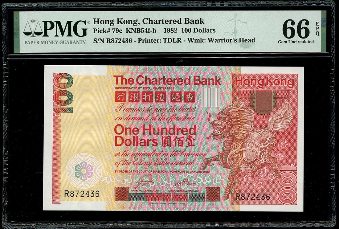 1982年渣打銀行100元,編號R872436,PMG 66EPQ