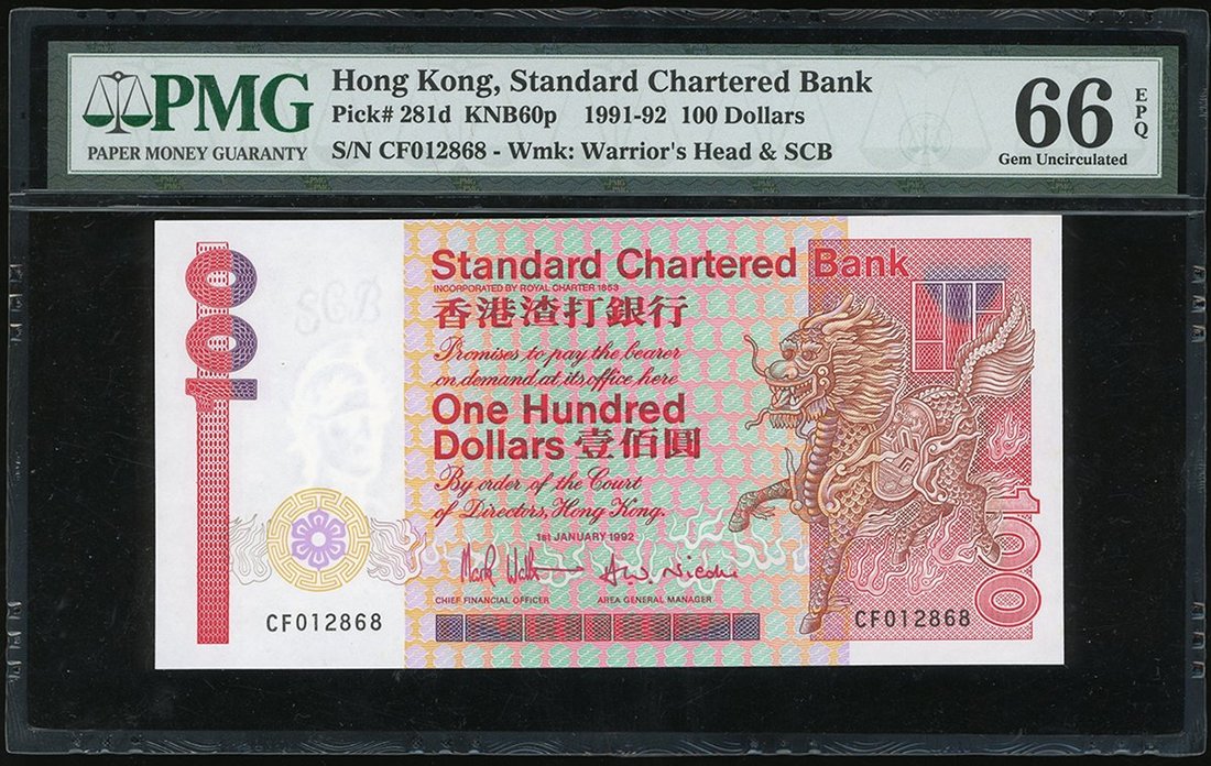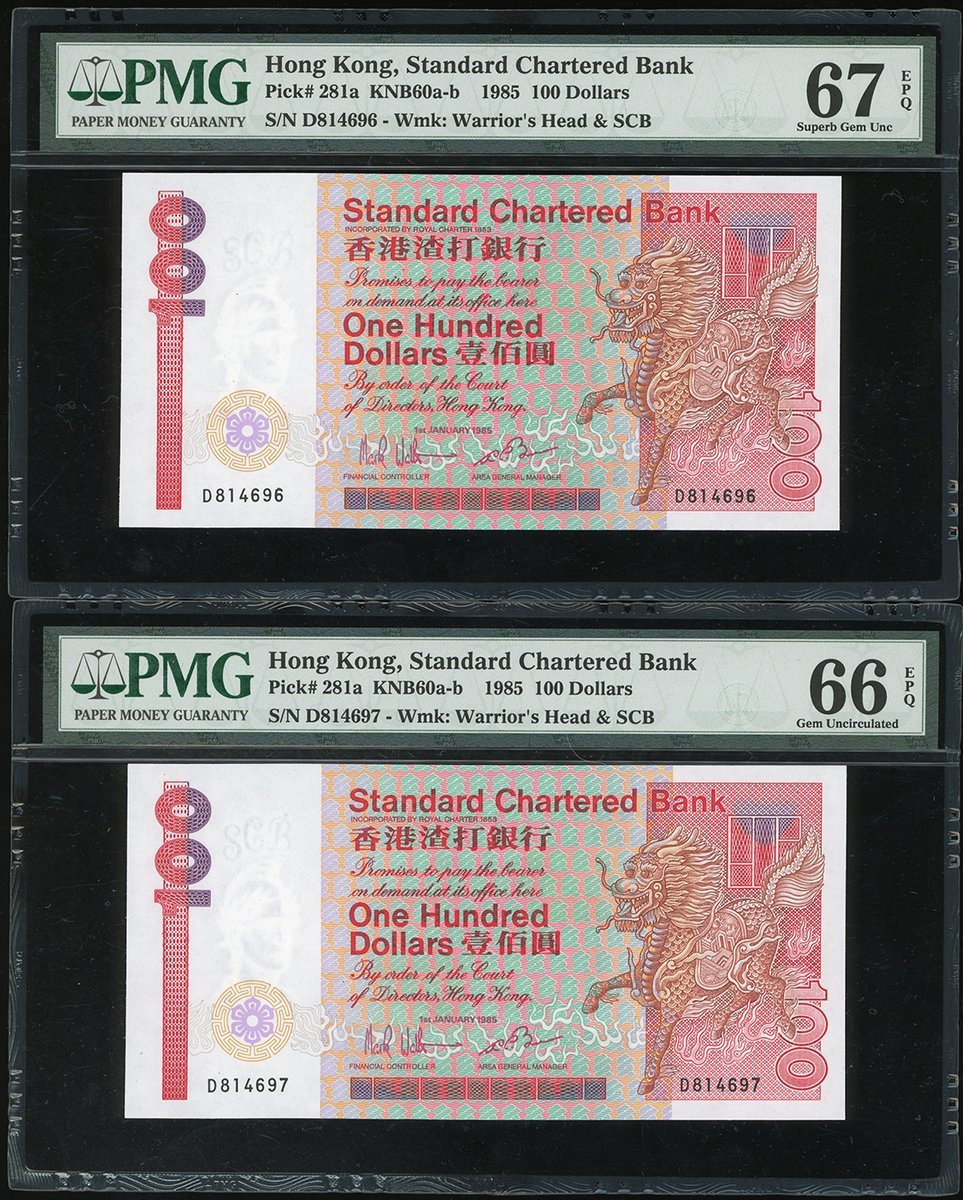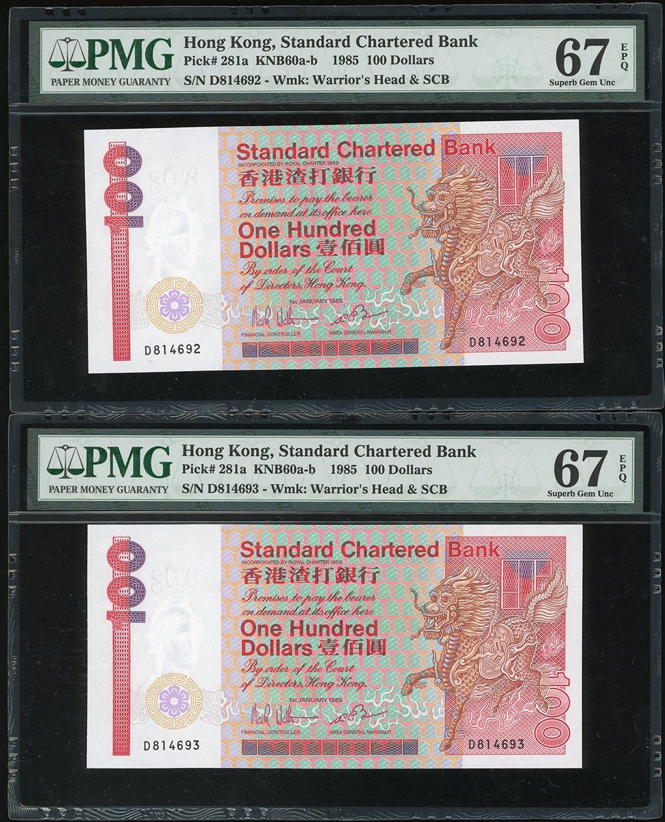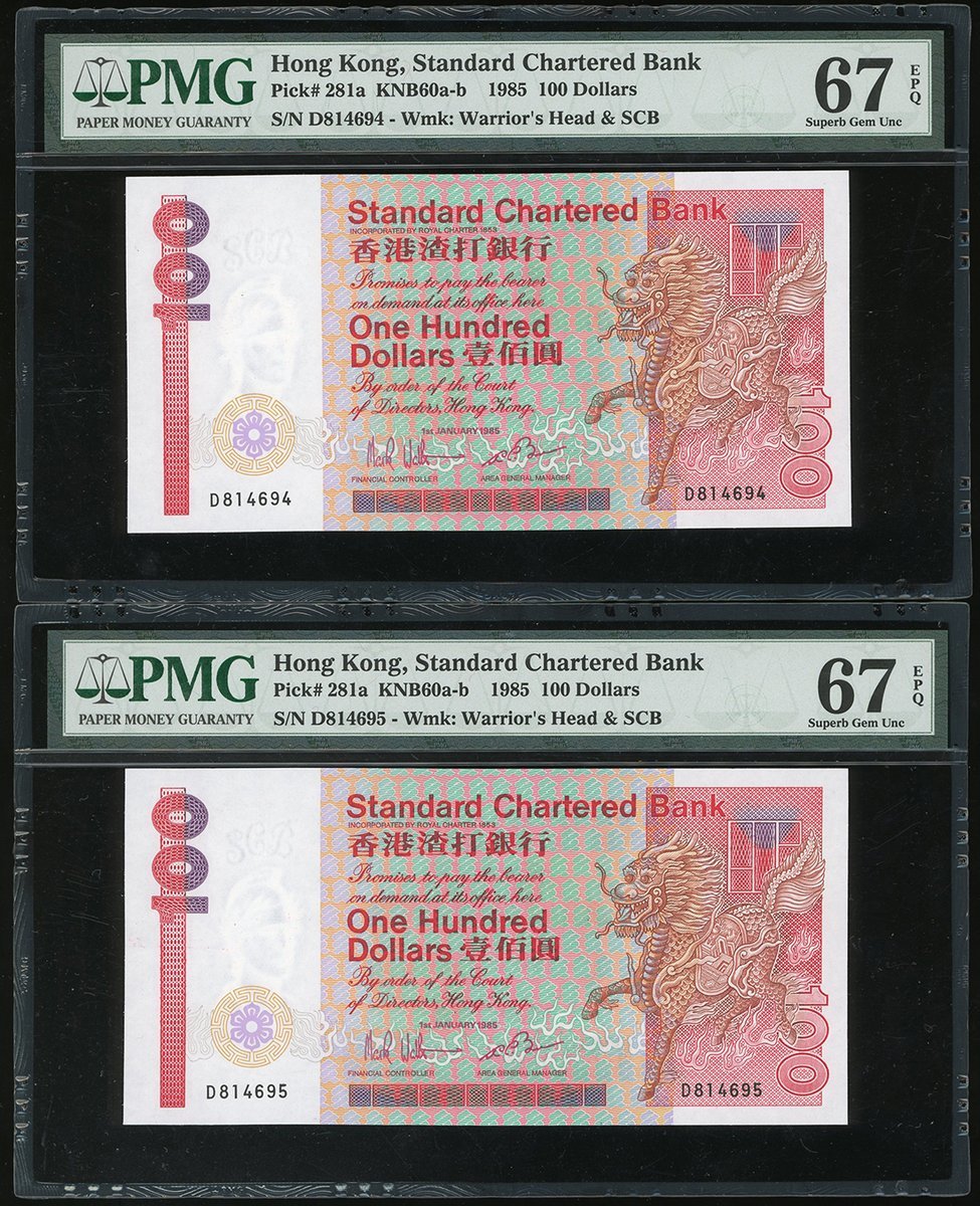 1985及1992年渣打銀行100元7枚一組,編號D814692-7及CF012868,均受PMG評級,前五枚67EPQ,最後2枚評66EPQ。