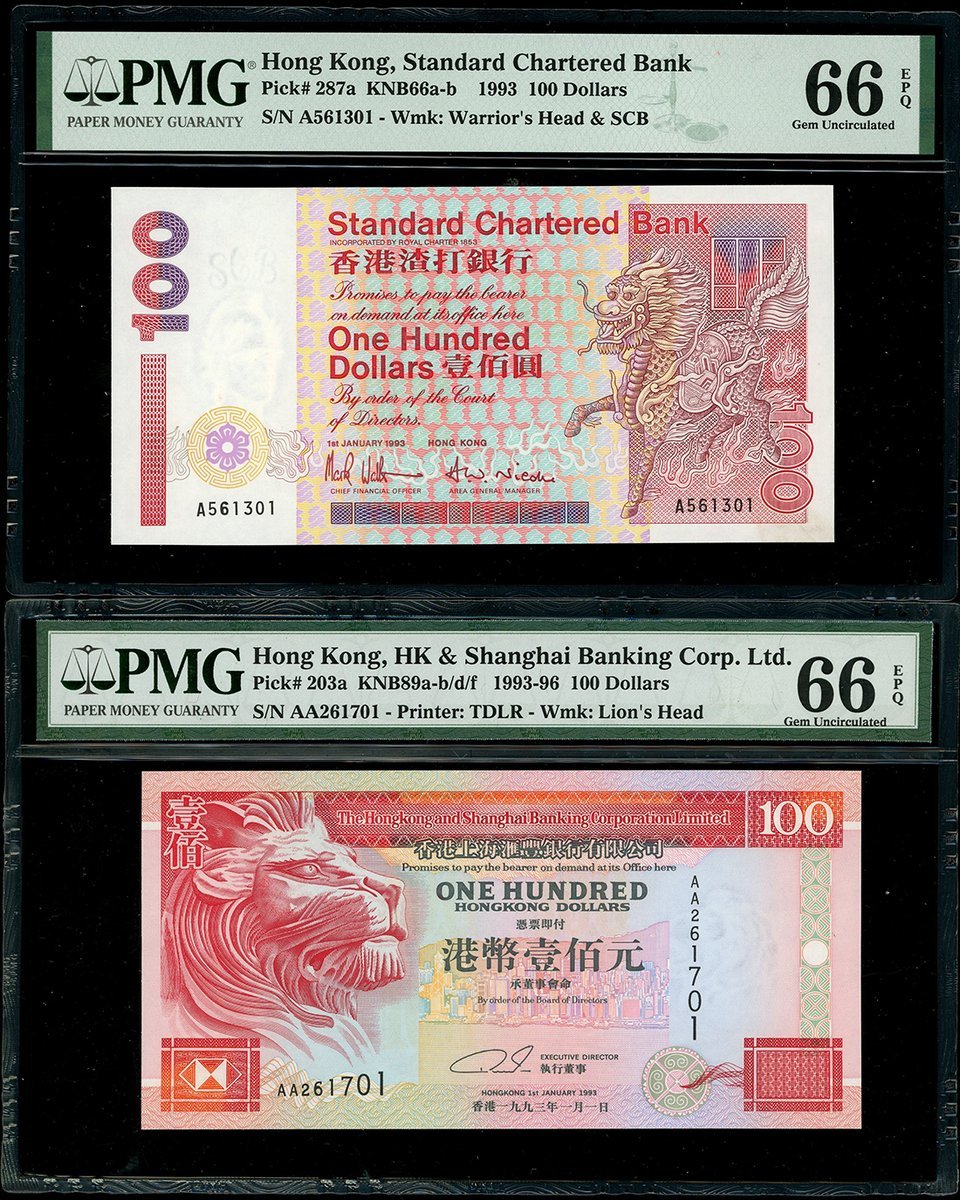 香港紙鈔一組2枚,包括1993年匯豐銀行及渣打銀行100元一對,編號A561301 及 AA261701,均PMG 66EPQ