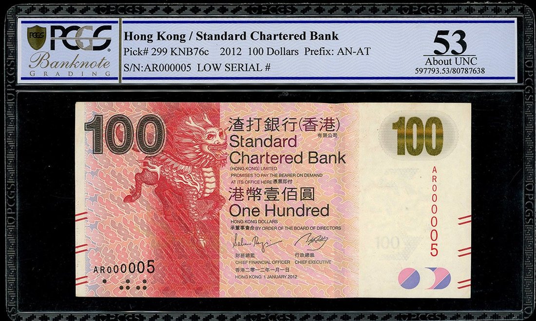 2012年渣打銀行100元,細號AR000005, PCGS Banknote 53,有黃