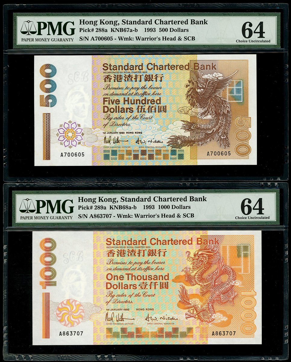 1993年渣打銀行500元及1000元一對,首字軌A700605及 A863707,均PMG 64