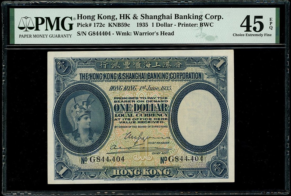 The Hongkong and Shanghai Banking Corporation, $1, 1.6.1935, serial number G844404, (Pick 172c), PMG 45EPQ Choice Extremely Fine
