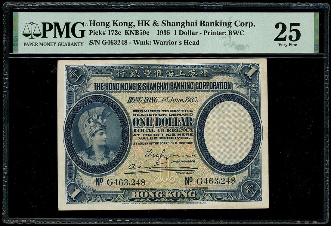 The Hongkong and Shanghai Banking Corporation, $1, 1.6.1935, serial number G463248, (Pick 172c), PMG 25 Very Fine