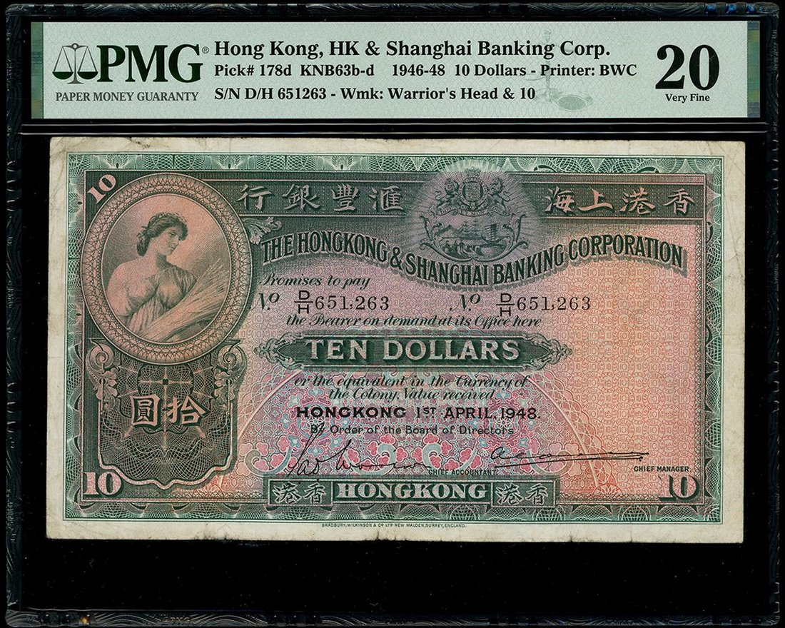 The Hongkong and Shanghai Banking Corporation, a pair of $5 and $10, 1.4.1941 and 1.4.1948, serial numbers N137206 and D/H 651263, (Pick 173d, 178d), graded PMG 25 and 20 respectively (2)