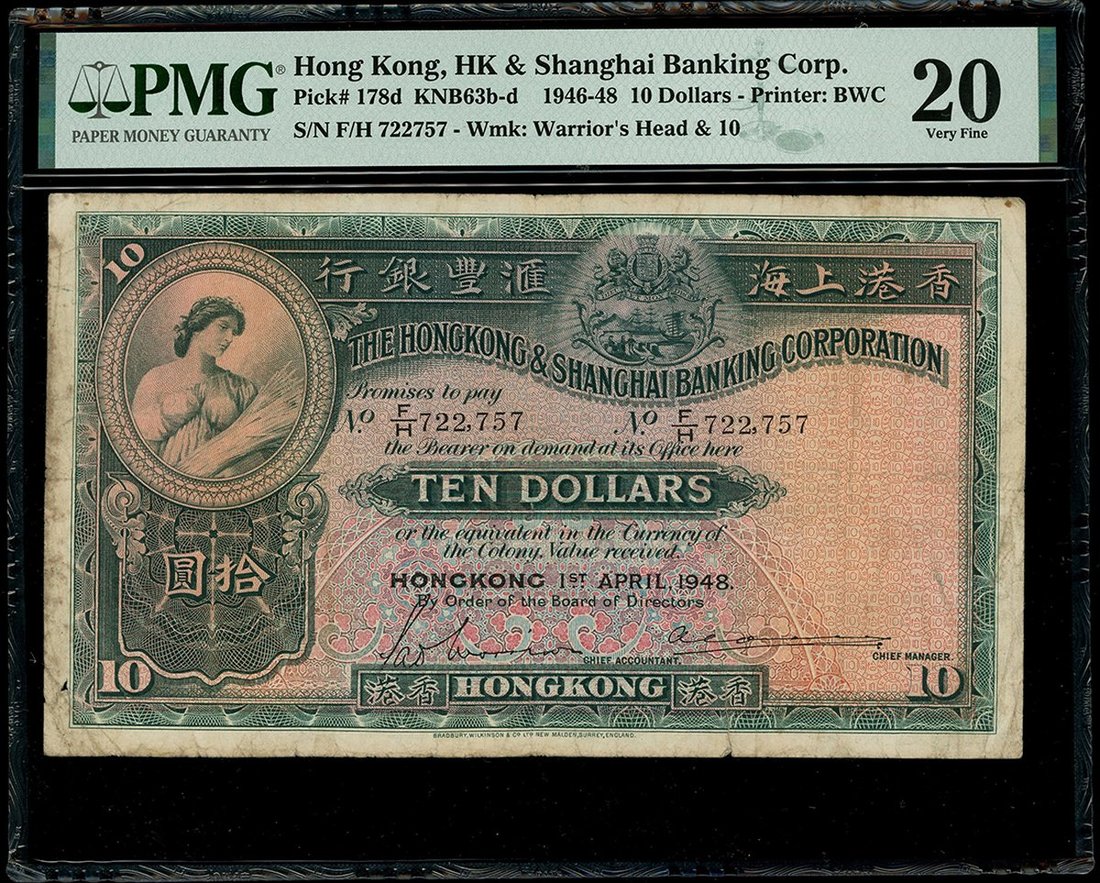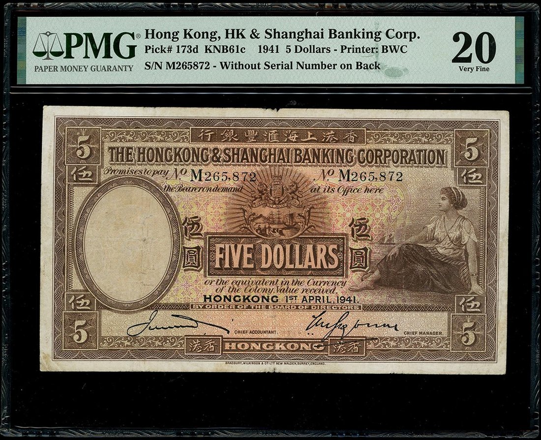 匯豐銀行1941年5元及1948年10元,編號M265872 及 F/H 722757,分別評 PMG 20 及 20 (有裂)
