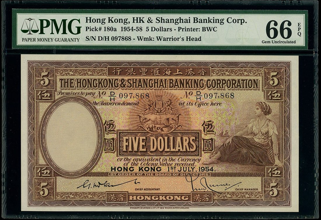 The Hongkong and Shanghai Banking Corporation, $5, 1.7.1954, serial number D/H 097868, (Pick 180a), PMG 66EPQ Gem Uncirculated and key date of the post war series