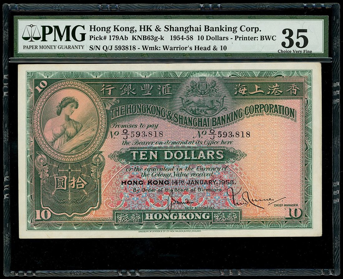 The Hongkong and Shanghai Banking Corporation, a pair of $5 and $10, 7.8.1958 and 14.1.1958, serial numbers J/H 899622 and Q/J 593818, (Pick 180a, 179Ab), graded PMG 40 Extremely Fine and 35 Choice Very Fine (2)