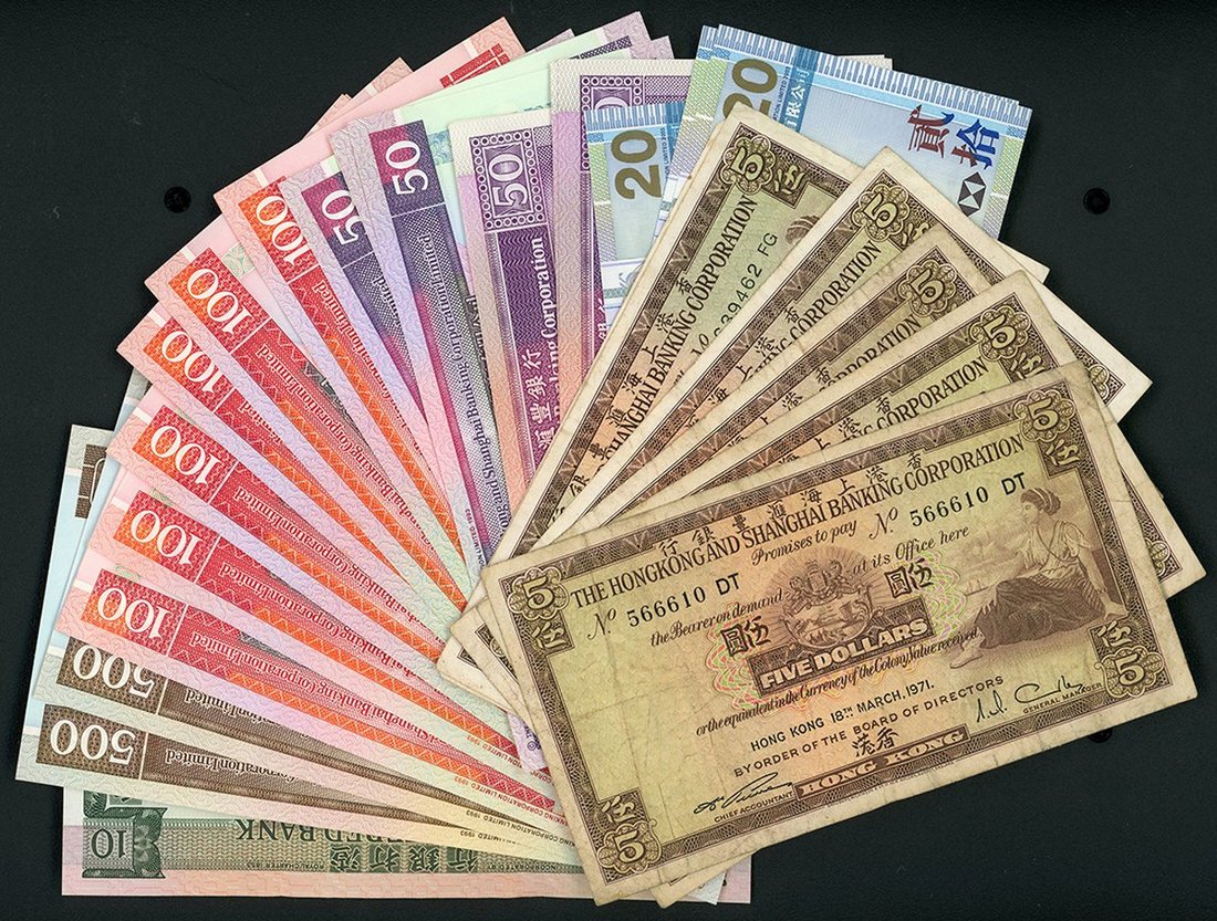 香港紙鈔一組43枚,包括匯豐銀行1971-75年5元5枚、2005年20元5枚、1988-1995年50元12枚、1994-2001年100元16枚、1999年500元3枚,及1970-75年渣打銀行10元1枚,面值2840元,匯豐銀行5元VF,渣打10元EF,其餘AU至UNC,有微黃及軟折