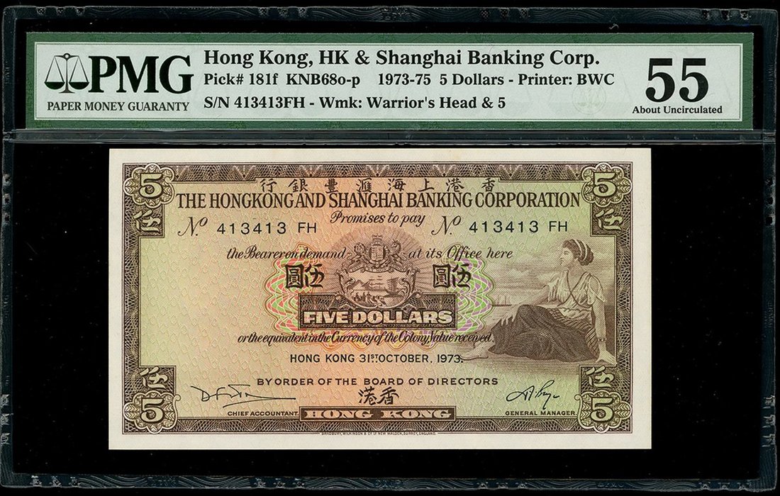 The Hongkong and Shanghai Banking Corporation, $5, 31.10.1973, repeater serial number 413413FH, (Pick 181f), PMG 55 About Uncirculated