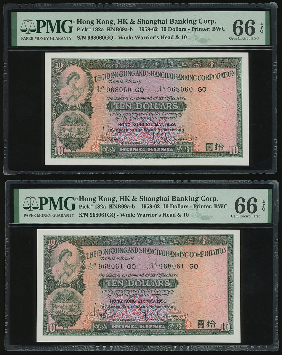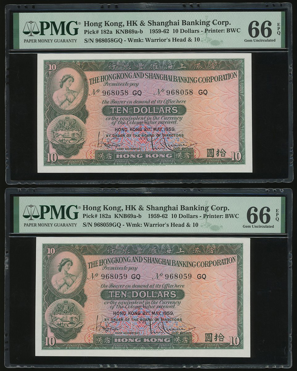 The Hongkong and Shanghai Banking Corporation, 4x $10, 21.5.1959, serial number 968058-061 GQ, (Pick 182a), all graded PMG 66EPQ Gem Uncirculated (4)