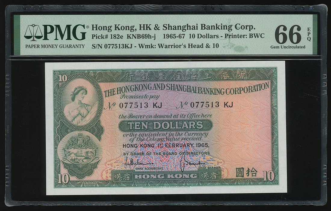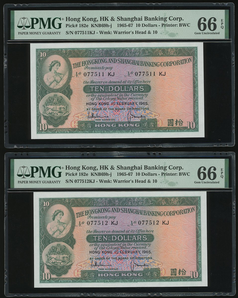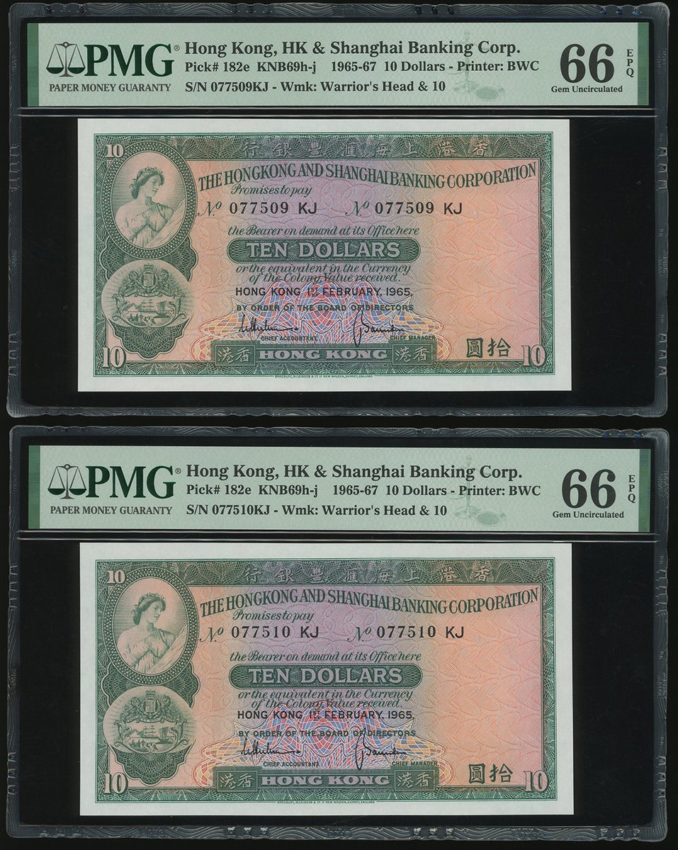 The Hongkong and Shanghai Banking Corporation, 5x $10, 1.2.1965, serial number 077509-513 KJ, (Pick 182e), all graded PMG 66EPQ Gem Uncirculated (5)