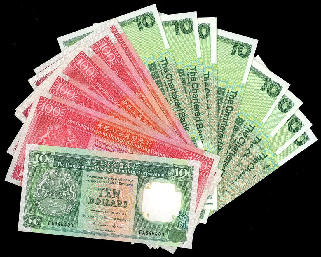 Hong Kong, group of 22x notes, consisting of: The Chartered Bank, 13x $10, 1.1.1980, serial numbers A774662-670 and 687-690, also HSBC, 1x $10, 1986 and 8x $100, 1985 (4) and 1987 (4), consists of some close/consecutive serial numbers, total face value of $940,