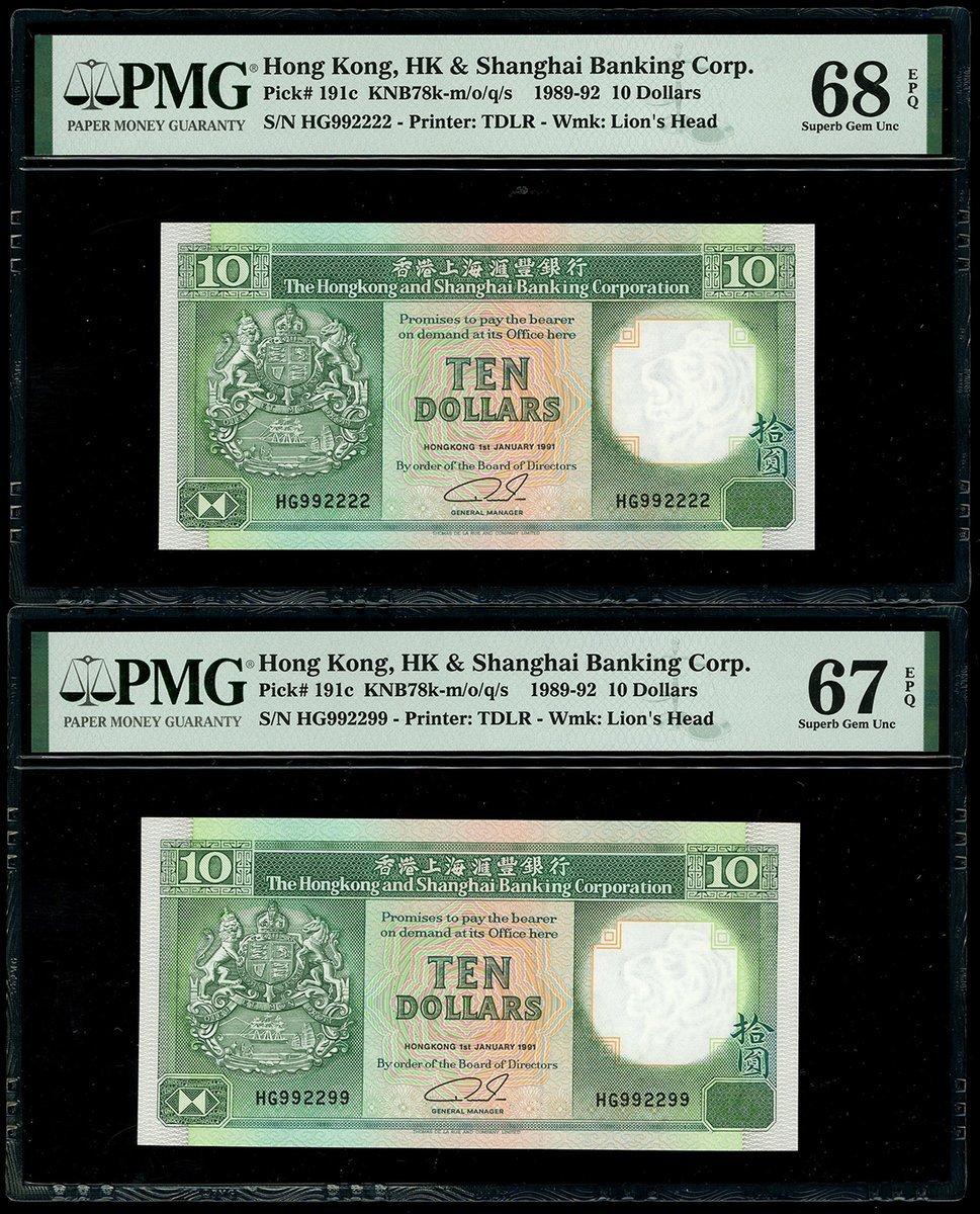 The Hongkong and Shanghai Banking Corporation, a pair of $10, 1.1.1991, fancy serial number HG992222 and radar serial number HG992299, (Pick 191c), graded PMG 68EPQ and 67EPQ respectively (2)