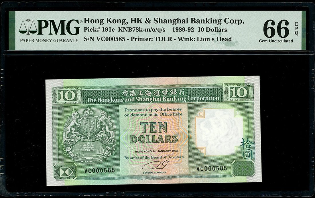 Hong Kong & Shanghai Banking Corporation, $10, 1st January 1992, low serial number VC000585, (Pick 191c), PMG 66EPQ.