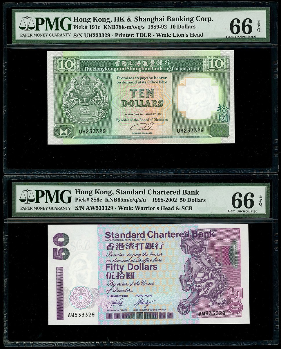 匯豐銀行1992年10元及渣打銀行2002年50元,相近編號UH233329 及 AW533329,均PMG 66EPQ
