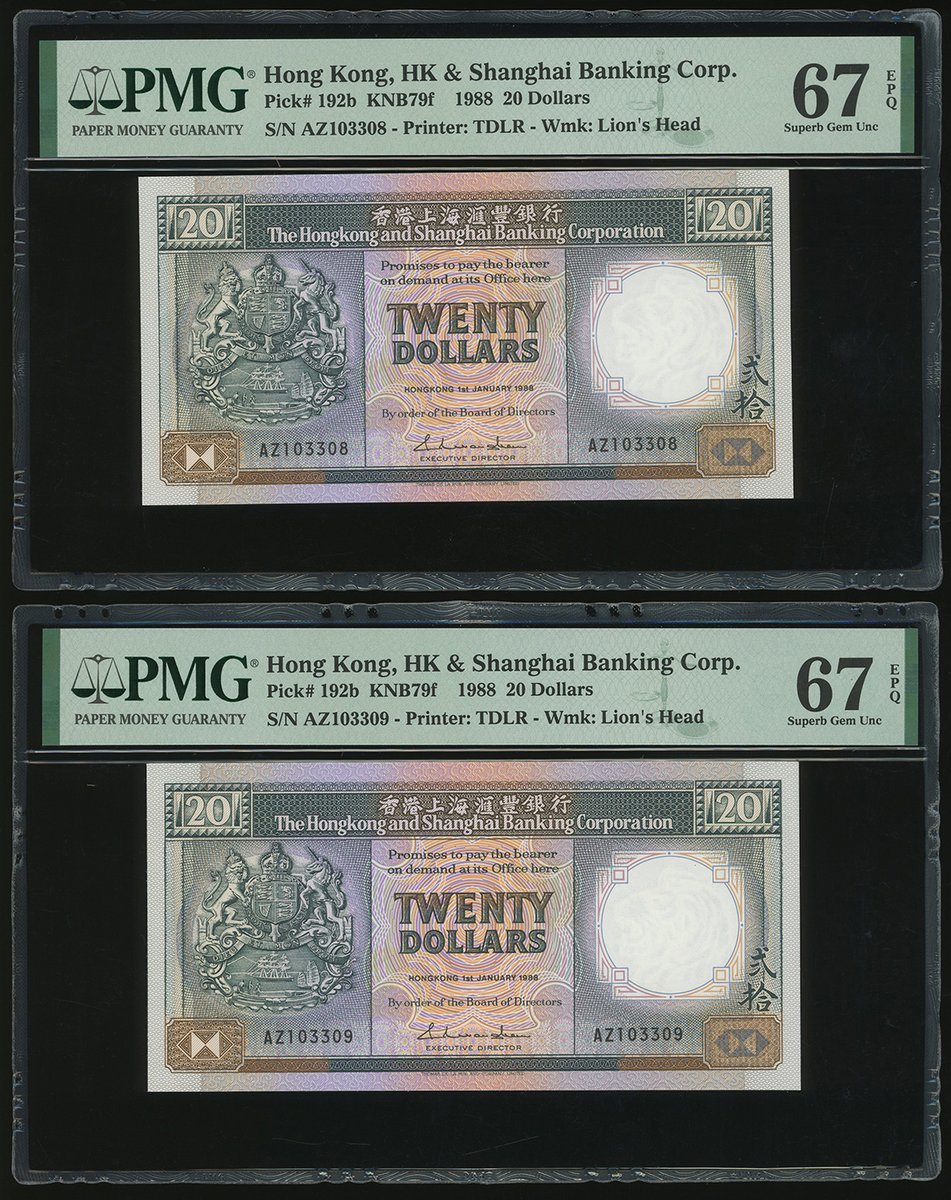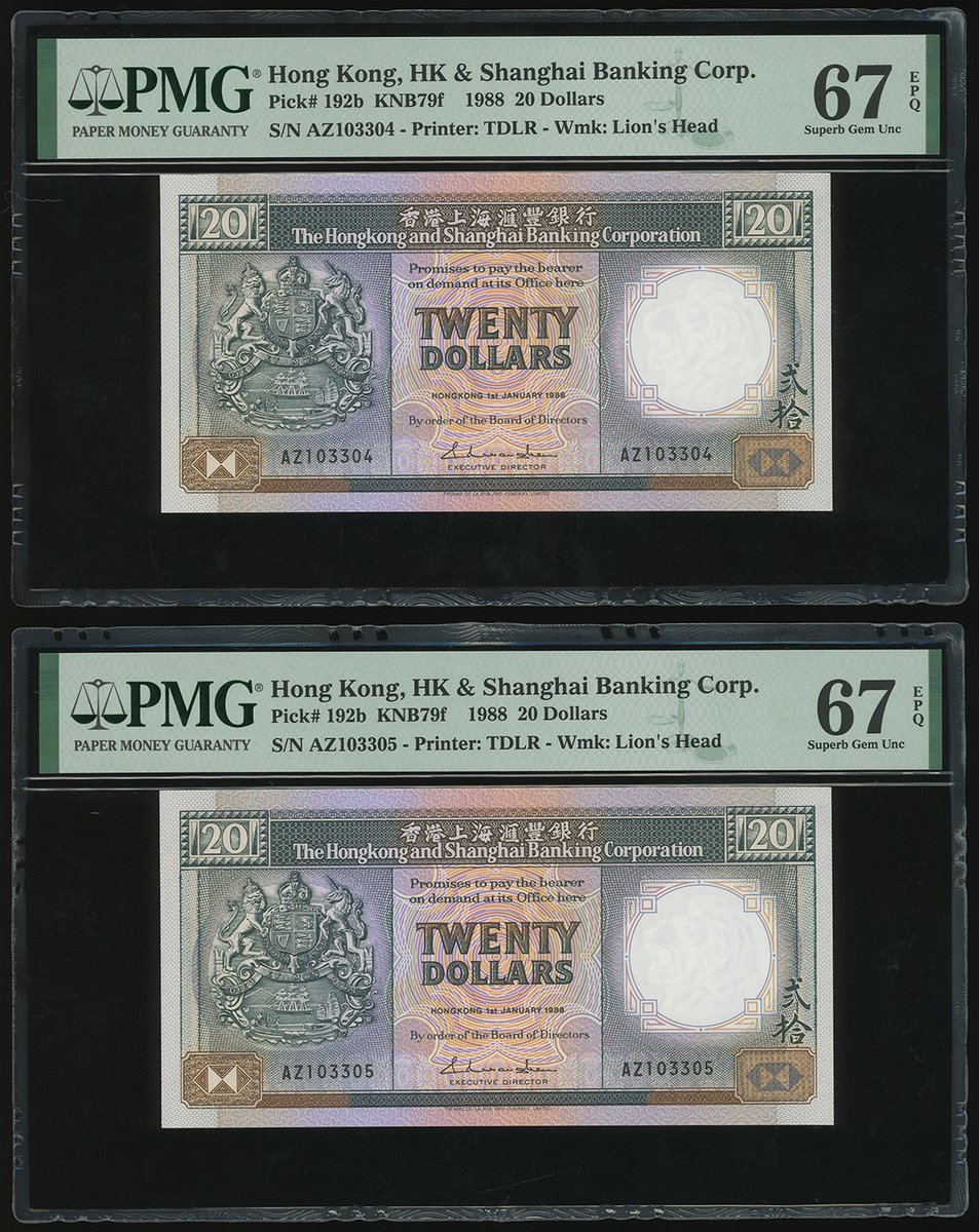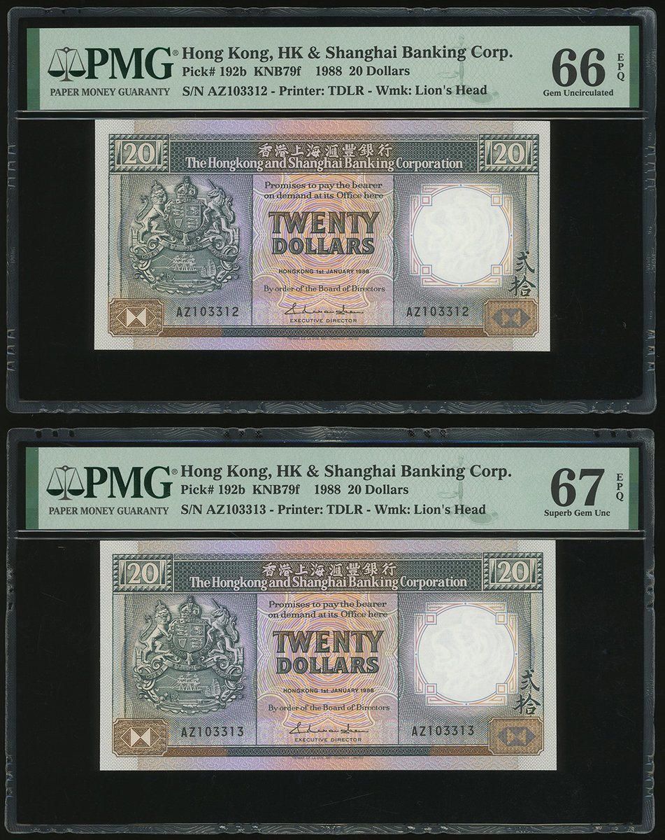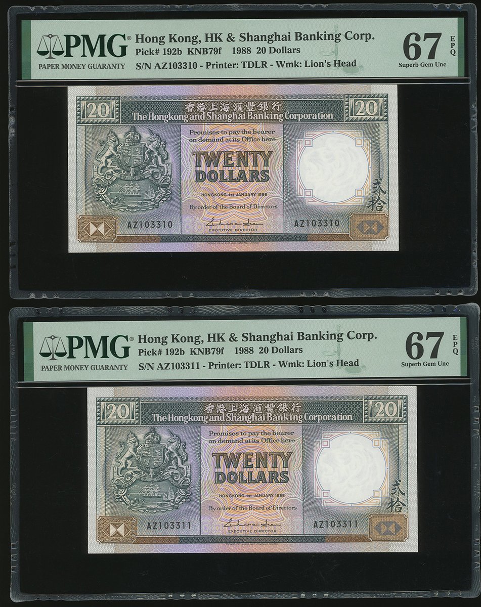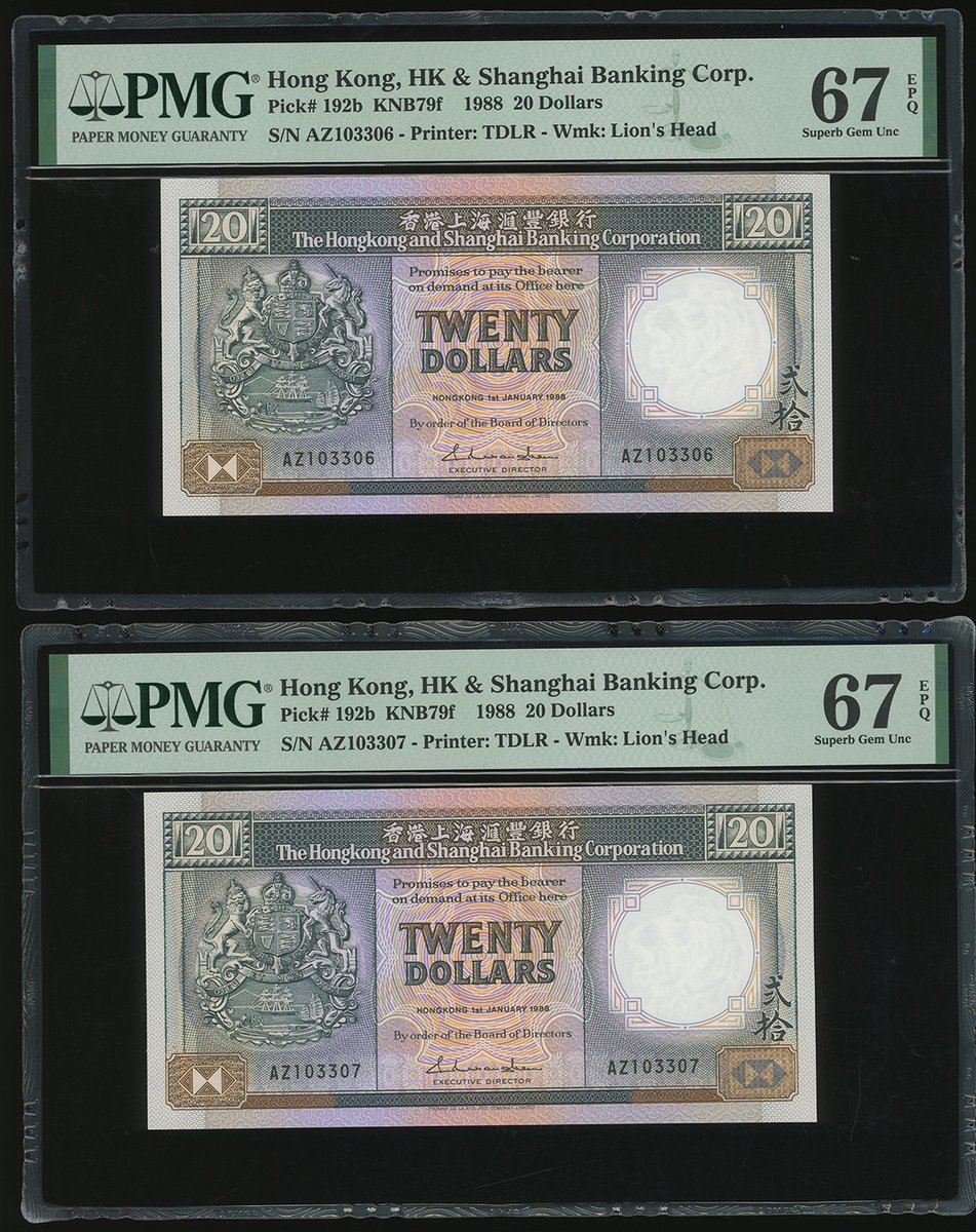 1988年匯豐銀行20元連號10枚,編號 AZ103304-313,均評PMG 67EPQ
