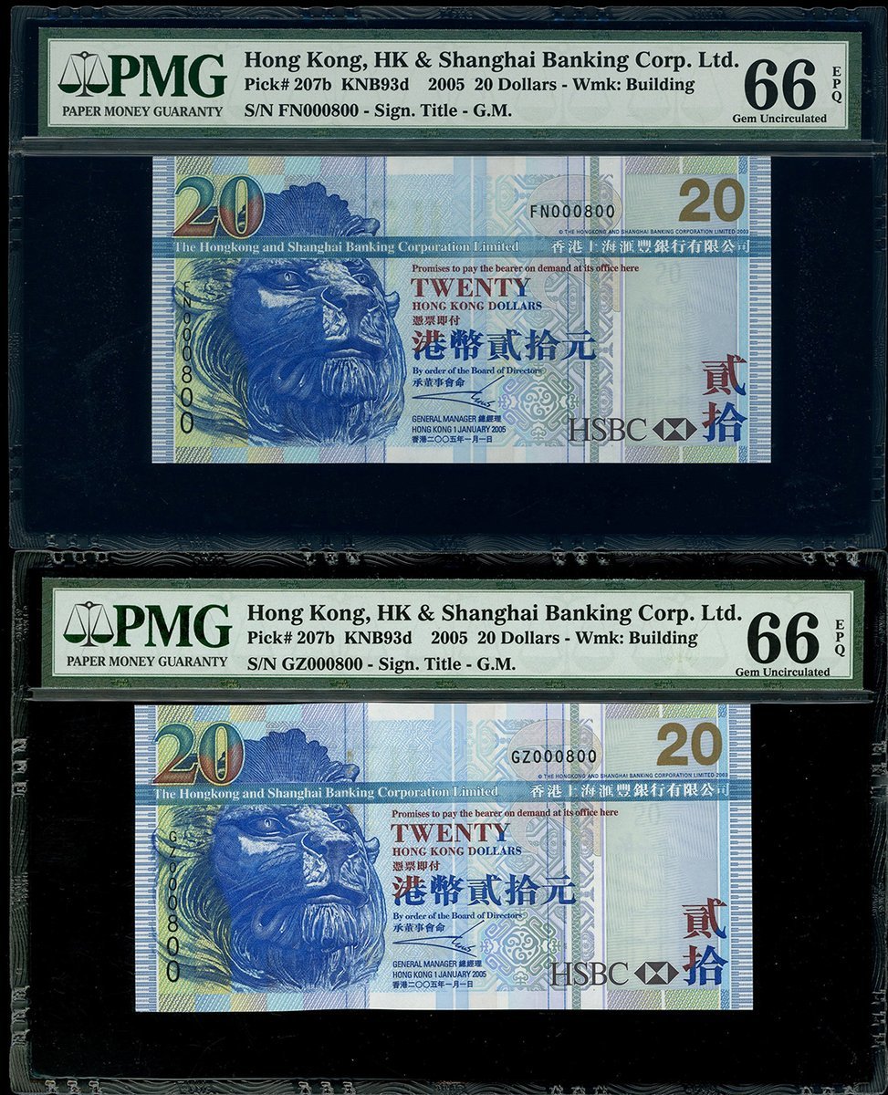 The Hongkong and Shanghai Banking Corporation, a pair of $20, 1.1.2005, same fancy serial number 000800, prefix FN and GZ, (Pick 207b), both graded PMG 66EPQ Gem Uncirculated (2)