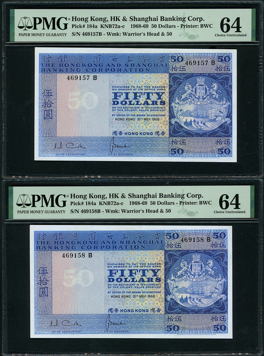 The Hongkong and Shanghai Banking Corporation, a pair of $50, 31.3.1968, consecutive serials 469157B-158B, (Pick 184a), both graded PMG 64 Choice Uncirculated (2)