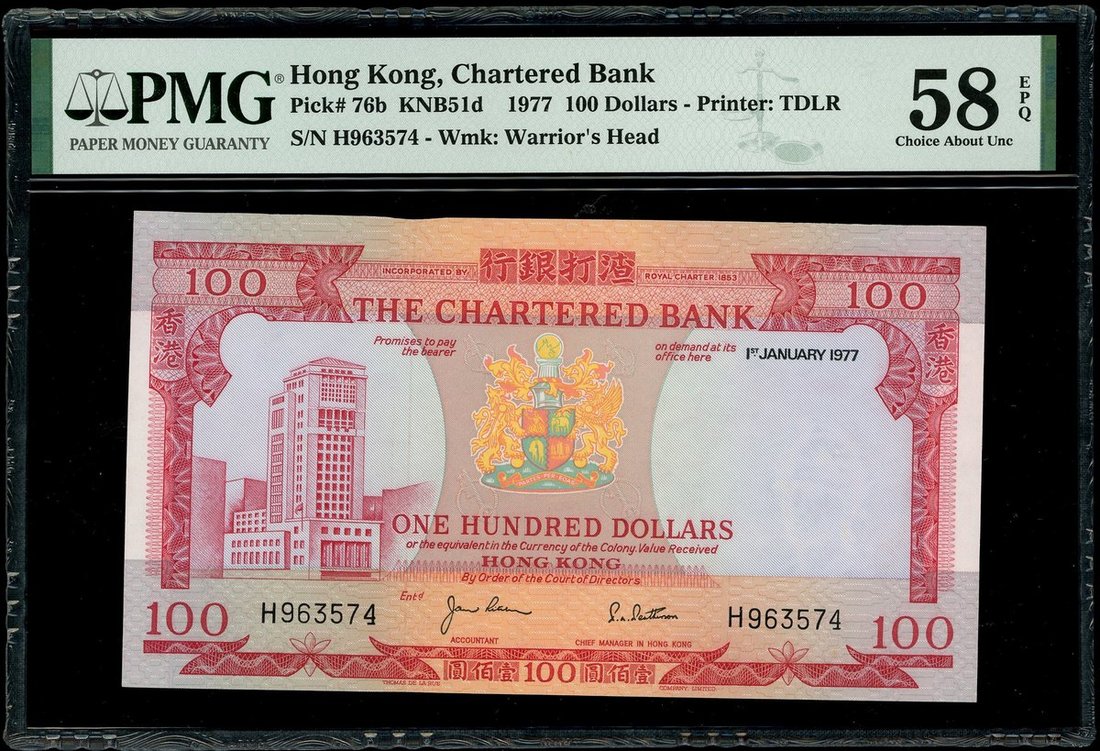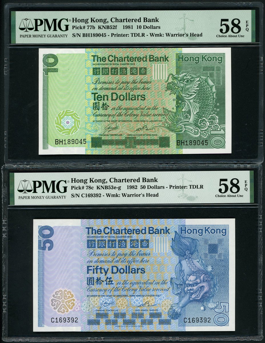 渣打銀行一組3枚,1981年10元、1982年50元及1977年100元,編號 BH189045,C169392 及 H963574,均評PMG 58EPQ
