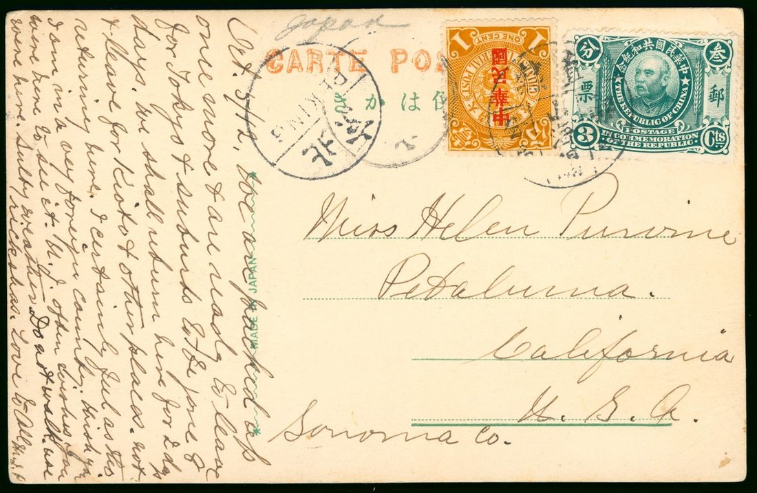 1912年山海關寄美國明信片1件,貼倫敦版蟠龍加蓋宋體中華民國1分1枚,共和紀念3分1枚,銷直隸山海關郵政分局圓形戳,經北京中轉,有北京小圓戳,明信片書信內容落款時間為12年10月5日,保存完好