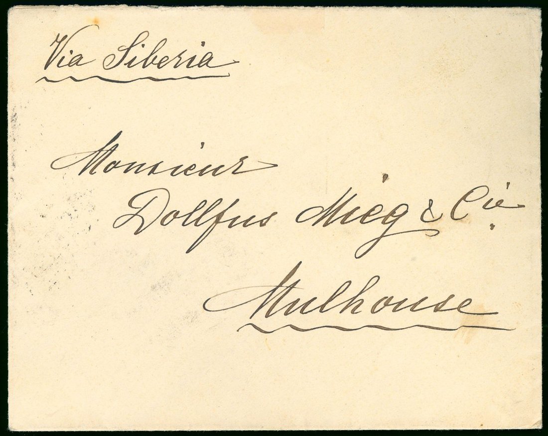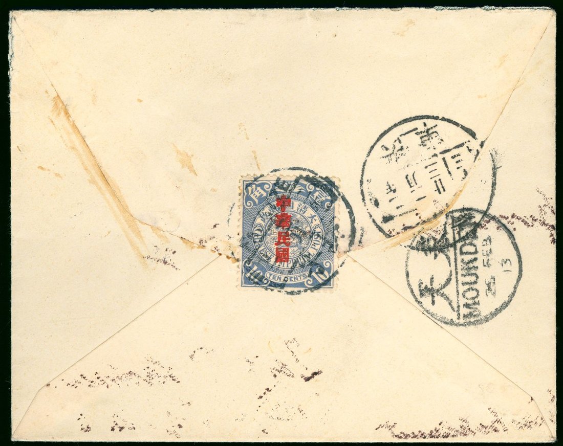 1913 (20 Feb.) envelope to France bearing on reverse C.I.P. Statistical Department ovpt. 10c. cancelled by Fangtze bilingual c.d.s., showing "Kiaochow-Chinan/Express Train No. 1" c.d.s. (23.2) and Moukden bilingual c.d.s (25.2) alongside, fine.