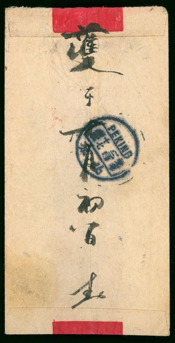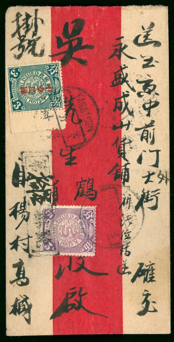 1912 (16 Dec.) registered red band envelope to Peking bearing CIP 5c. and overprinted 3c. tied by Yangtsun "Yuan Nien" c.d.s. and showing framed "Registered" in black, Peking (17.12) arrival c.d.s., very fine.