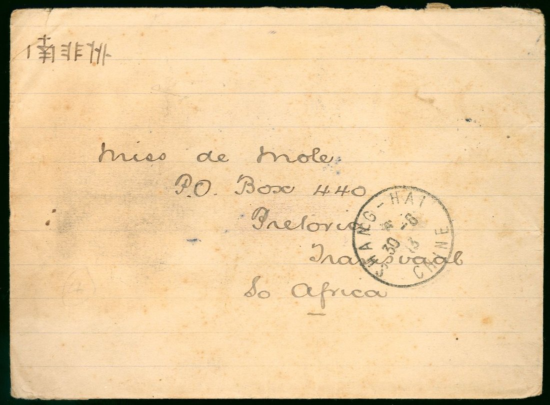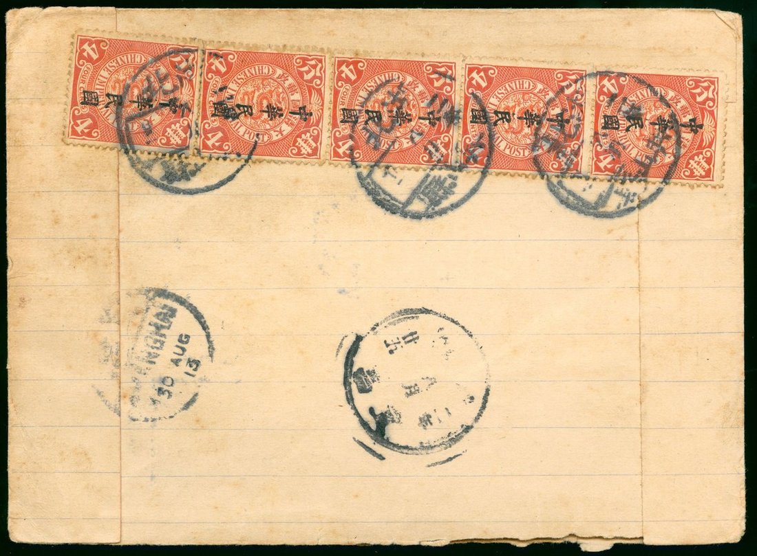 1913 (21 Aug.) an envelope to South Africa bearing coiling dragon overprinted 4c. (5) tied by Kingshanhsien c.d.s., via Ichang (25.8) and Shanghai (30.8), rare destination.)